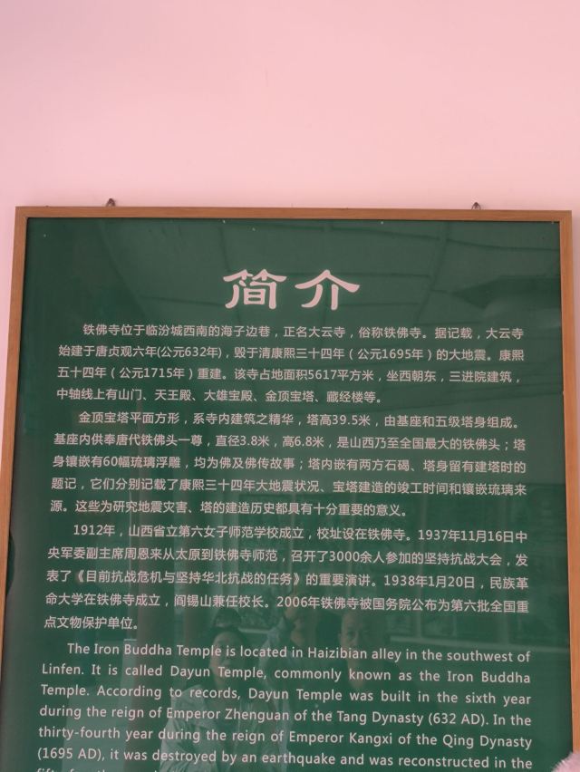 4分 满意临汾大云寺俗称铁佛寺。在临汾市西南。始建于唐贞观年间, 清康熙三十四年(1695年)地震毁坏,五十四年重建。