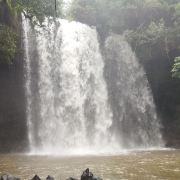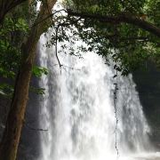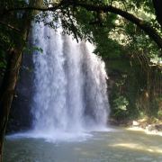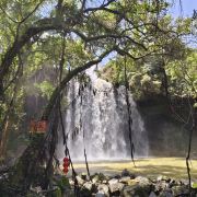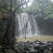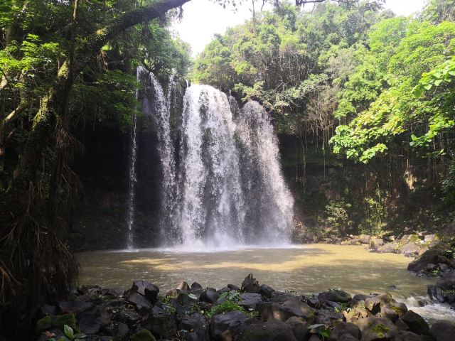 5分 超棒在海南大大小小的瀑布很多,居仁瀑布也称古银瀑布,在海南小有名气。居人瀑布位于海南临高县皇桐镇居仁村西部附近,距县城以东20公里。史称“古银瀑布”,这一个大潭,有“三潭九曲”之美称。瀑布系平川落差而致,落差20米,幅面20米,幅宽400平方米;周围怪石林立,形状各异,千姿百态。后面树木茂密,宛如碧海,屹立在怪石上,枝繁叶茂,覆盖如亭。错节盘根,透出倔强的生命力。处处花香鸟语不断。临高居仁瀑布西侧顶端挺着两株古榕树,树底有几块巨大的怪石,其中一声书刻着“海南一绝”四个大字。怪石上面,飞瀑倾泻,开如苍龙吐珠,蔚为奇观。怪石底下有一个大黑洞,即“观音洞”,瀑布从悬崖经壁飞泻而下,似烟如雾,锁住洞口,犹如《西游记》神话传说的水帘洞。