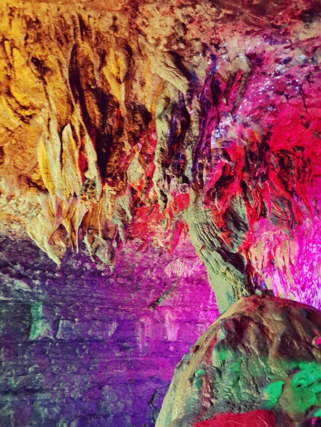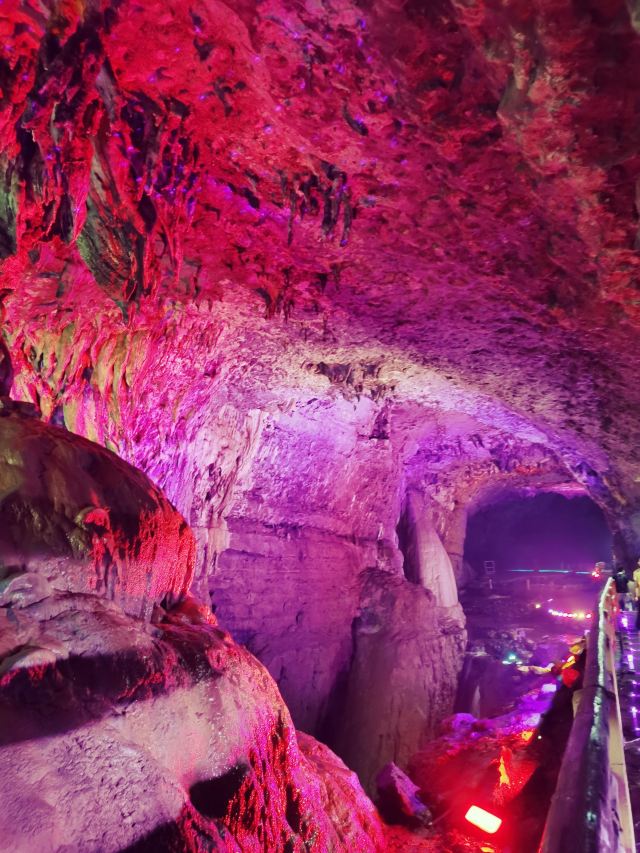 (3)洞。洞中天河是我多年前第一次查到天意谷的印象,天意谷布局比较完美,从头到尾,逐渐深入,路途并不遥远,但每处都有值得欣赏的所在,最后才是洞中天河,好吃的总是留到最后。他们借用基督教“圣父圣子圣灵”三位一体的体式,自创了天母、天佛、天河一体的“三天神灵”,去了我才知道还有天母天佛。天佛好理解,洞口进去不远有个大钟乳石,是滴水从上至下连成一体的石灰岩巨石,上小下大,取名是佛;天母就很有意思了,一个和恩施腾龙洞差不了多少的大洞,洞里有个佛像个baby,有天河流出来,恰好还处于最深处,甚至钟乳石自上而下吊坠都像毛一样逼真。果然毛说的好啊,天生一个仙人洞,无限风光在险峰,华蓥山有个男性的,天意谷有个女性的,不愧是夫妻景区,完美匹配。洞内除开佛之外,深处的深处就是传说中的洞中天河了,没有宣传片拍的那么震撼,但在一个洞中居然有如此大的瀑布,更重要的是还有自然光倾泻进来,应该算中国唯一、世界罕见了