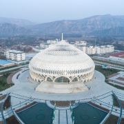 临夏大剧院占地面积52300平方米,地上建筑面积15000平方米,建筑总高度约46米,在建筑造型设计上采用的是识别力强的简洁几何球体。