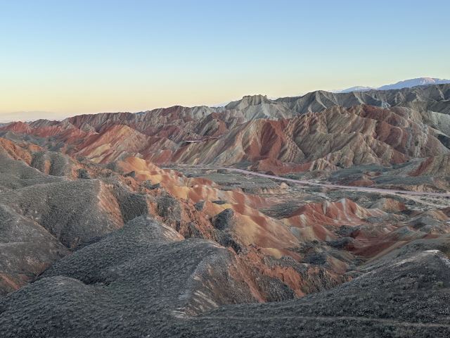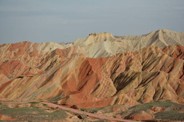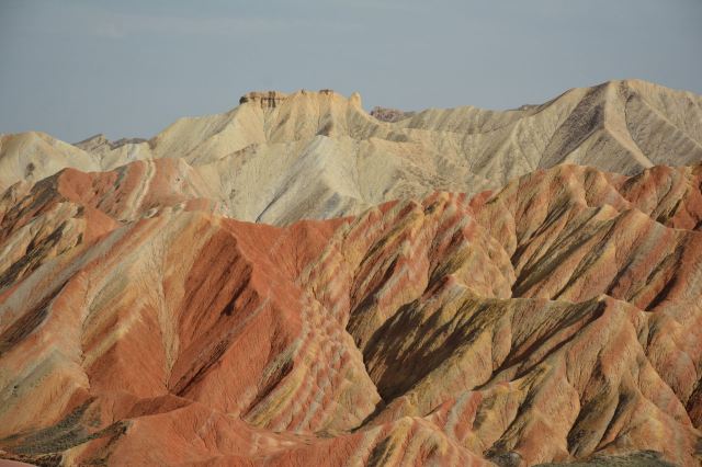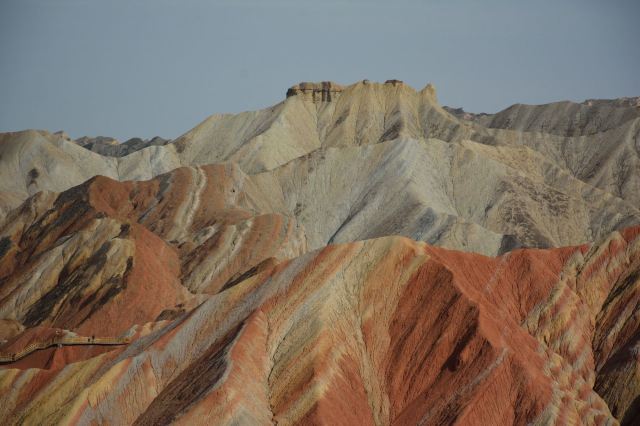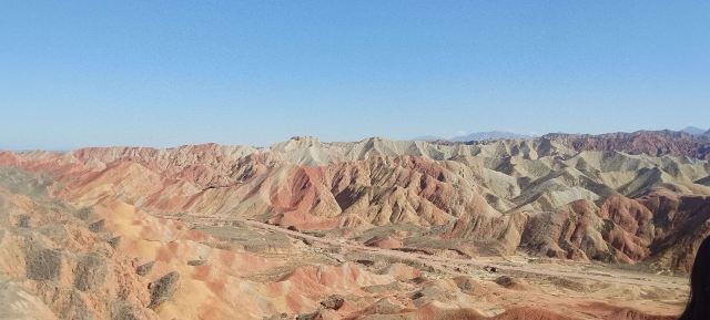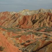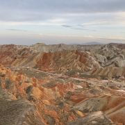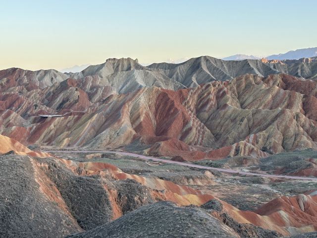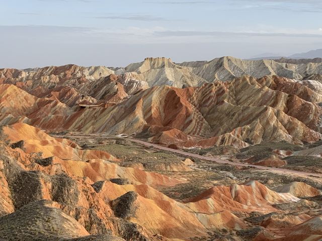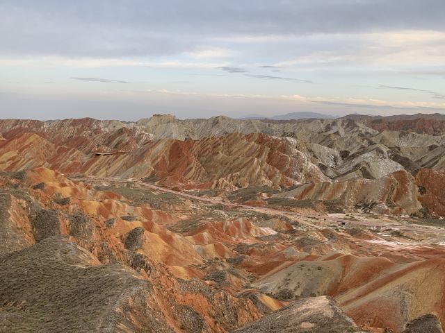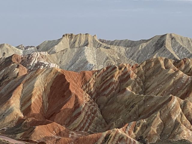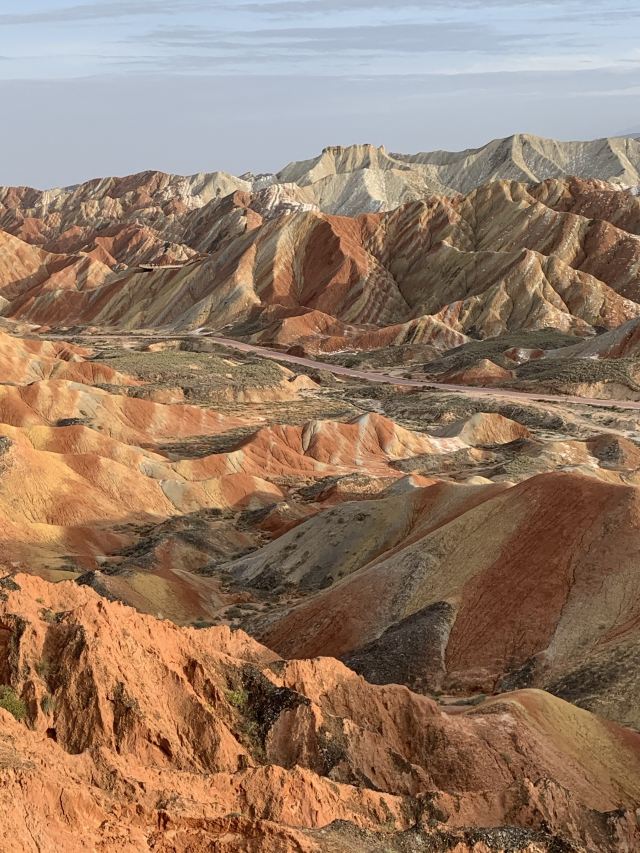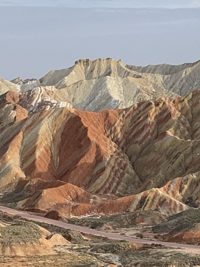 5分 超棒小布达拉宫。在张掖七彩丹霞4号观景台,当沿着栈道登上山顶向前方遥望,有一处景观酷似远观布达拉宫。那天我们是下午6点开始沿着栈道登上4号观景台,人很多,用了近30分钟才龟速到达观景台山顶,面向丹霞群山,景色震撼,面对着小布达拉宫壮美景色,在寒风中等待日落时的美景。如果是第一次见到这种地貌,大多会震撼。各种颜色,分界清晰,条纹层叠,有的如屏风,有的如五花肉,有的红成了一片,在棱角分明,怪石嶙峋的远处形成了刀山火海。如果这些景观是人为的还罢了,偏偏它是自然形成的,你会由衷地感叹大自然的神奇,鬼斧神工,巧夺天工。