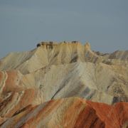 七彩丹霞景区-小布达拉宫,直立高耸的砂岩,就像一座幽深的古城堡遗迹,突兀地伫立在大地上。 这样的造型,是在流水侵蚀和风力吹蚀的共同作用下发育起来的。由于岩性软硬不一,导致了风力吹蚀的差异性,结果形成了许多相对高度为10-30米的层状墩台,构成奇幻的古堡造型。由于气候干旱,岩石上并没有太多的植被覆盖,就显得更为彪悍、粗犷。