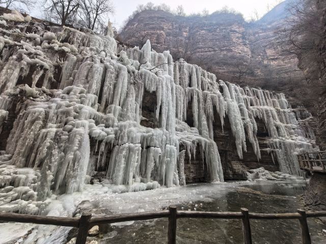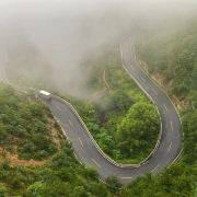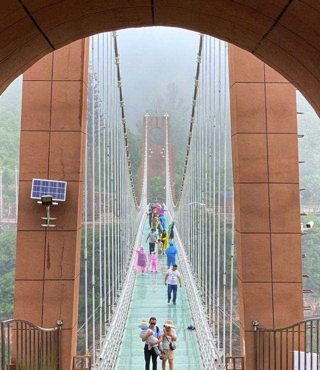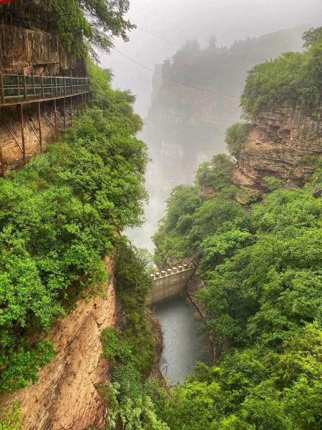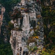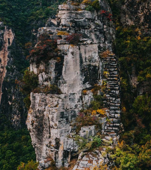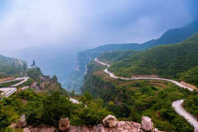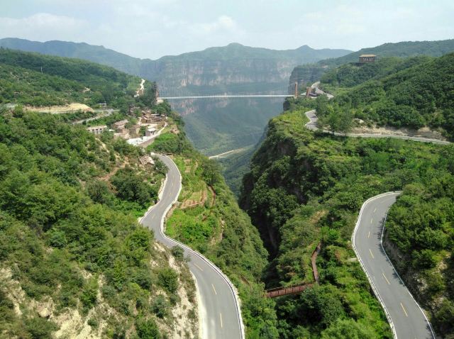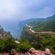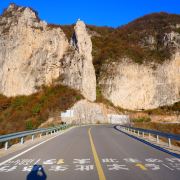 太行天路位于太行山之巅,北起桃花谷景区,南至仙霞谷景区,全长约30km,既是景区环线游览道路的重要组成部分,也是俯瞰太行山壮美风光的观景台。乘坐观光车游走于太行天路,犹如置身百里画廊,满眼望去,无处不是大气磅礴的国画山水长卷,深邃的峡谷、直立的岩壁,带给游客强烈的视觉震慑。结合山势山形,太行天路沿线设置有10余座观景台,临栏远眺,感觉心胸开阔、杂念全消。