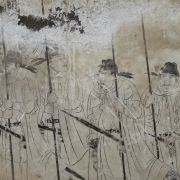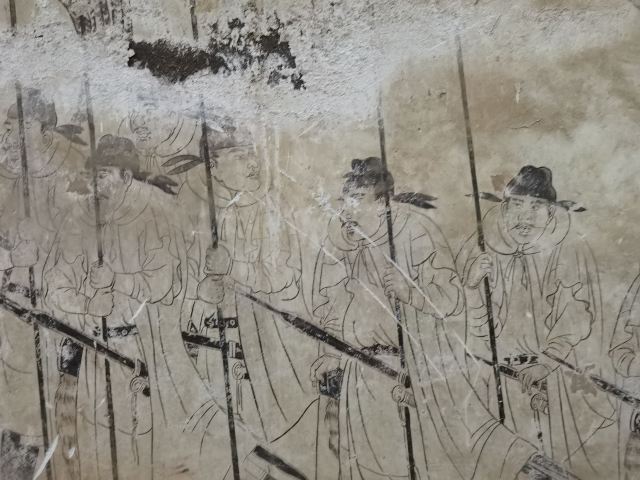 长乐公主(公元621—643年),名丽质,是李世民生前第5个女儿,系长孙皇后所生,13岁下嫁于长孙冲,23岁暴病而亡。长乐公主墓位于唐太宗昭陵,与昭陵陵体仅一沟之隔。步入长乐公主墓墓道,可以看到天井、过洞、壁龛、甬道、墓室,整个墓道全长48.18米,气势雄伟。地宫中经典的就是墓道两侧上的壁画,这也是唐墓的一大特点。