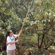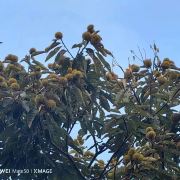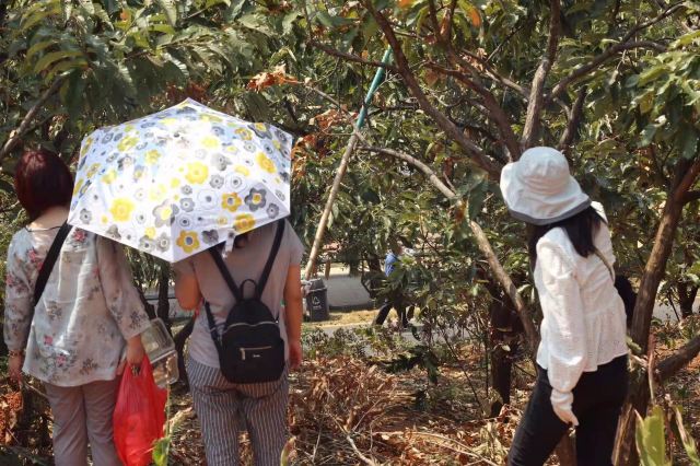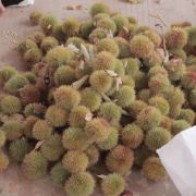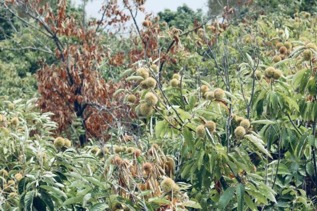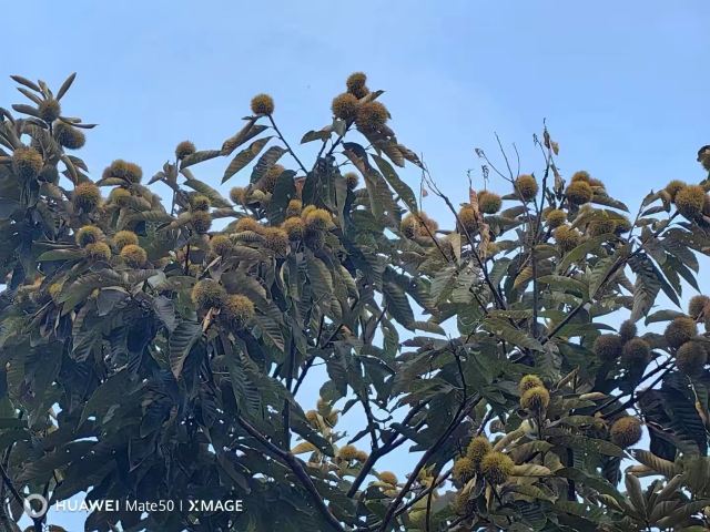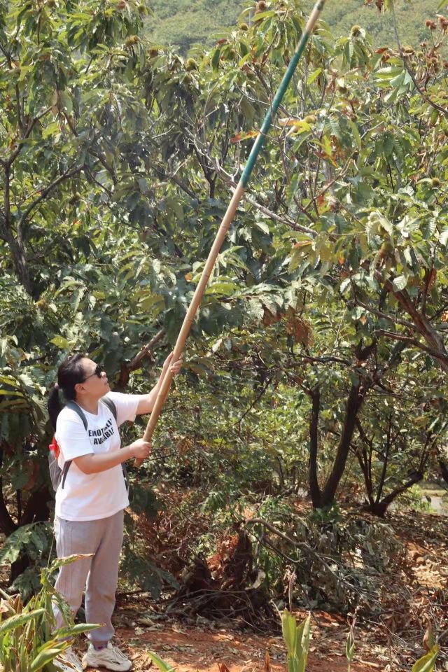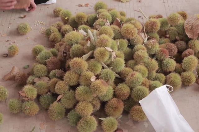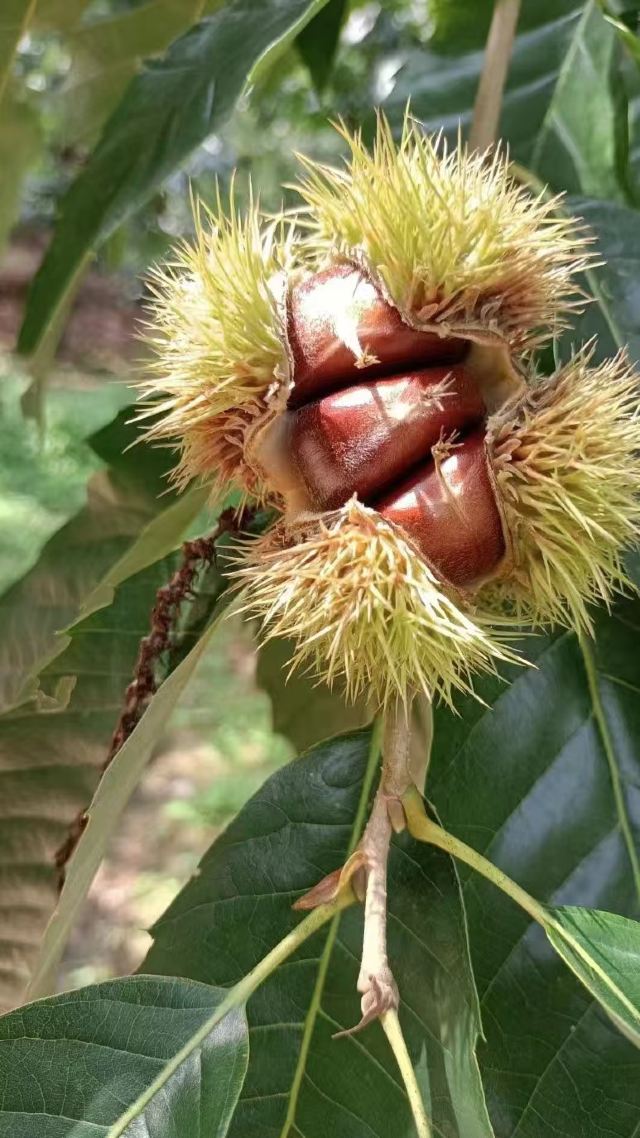 【板栗】景区在搞板栗节,进景区会给你发一个袋子,买了门票就能免费带走2斤,路边上有好多板栗的废壳刺球,应该是有很多人来玩过了,景区的板栗树确实也挺多的,,最下面的已经没啥板栗了,需要拿长棍子打树上面,也有熟的板栗是用脚蹬两下树干就能掉下来的。
