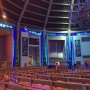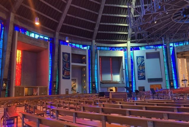 3分 不错教堂的外观是乳白色,它的顶部是荆棘的装饰元素,整个外观看上去像是一个倒置的漏斗,内部的空间很大,有很多的座椅,但是并没有特别的进行宗教方面的装饰。