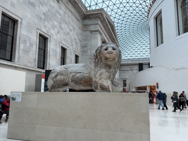 大中庭原为大英图书馆的一部分,图书馆迁出后,这里改建成以白色为基调的有顶广场。广场巨大的半透明屋顶由许多块形状奇特的玻璃片组成,与白色石材相结合,即使是在伦敦天气阴暗的时候,这里依然采光极好。中庭陈设着的雕塑都是实打实的珍品,例如大理石雄狮和复活节岛石像都有展出。此外,不时会有各地艺术家在这现场演奏,为严肃的博物馆增添轻松的气氛。