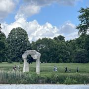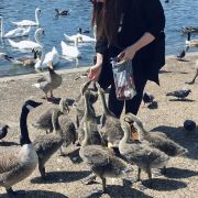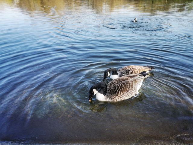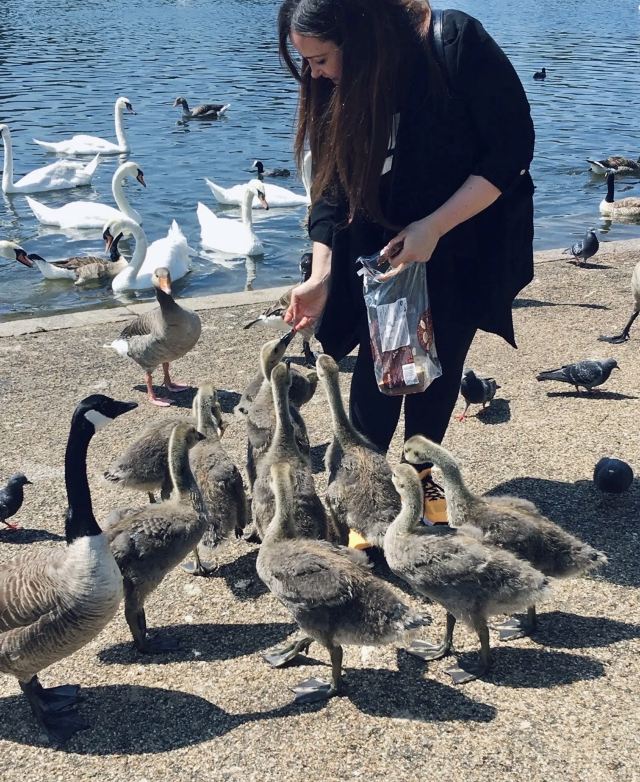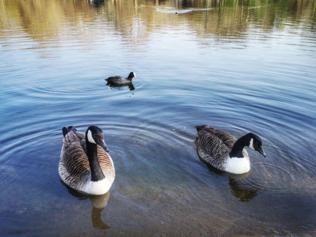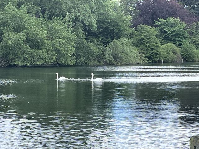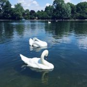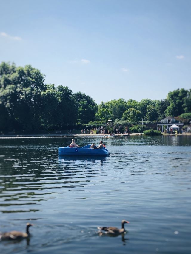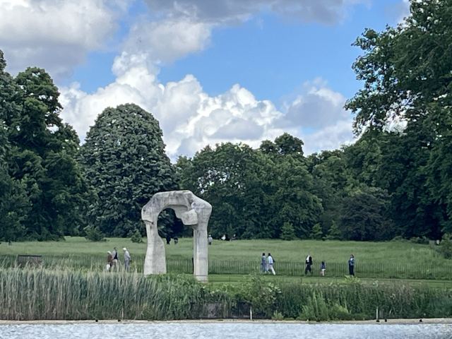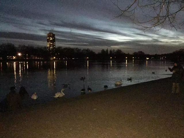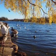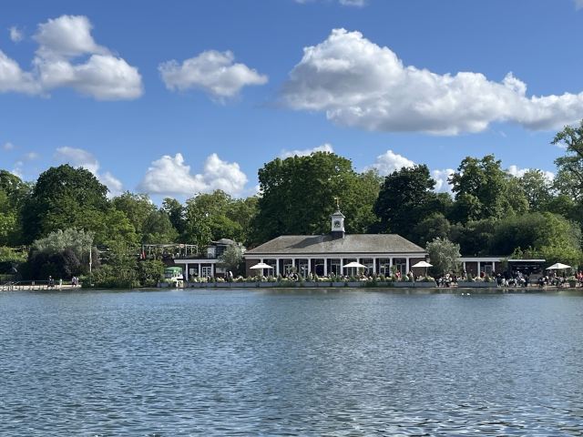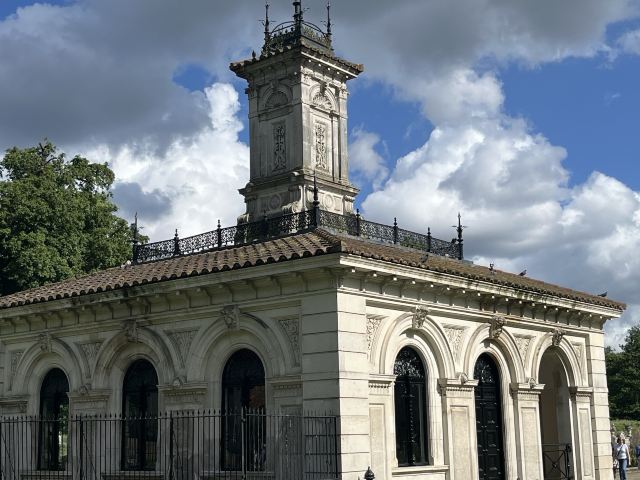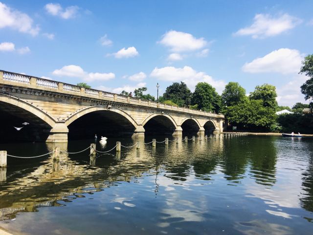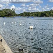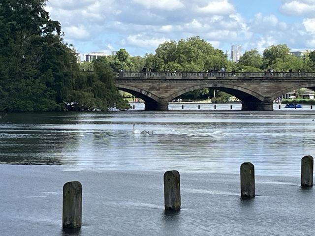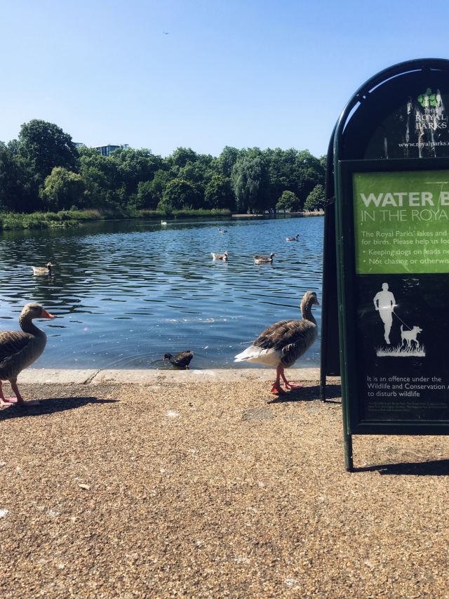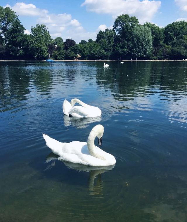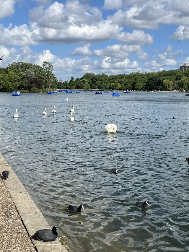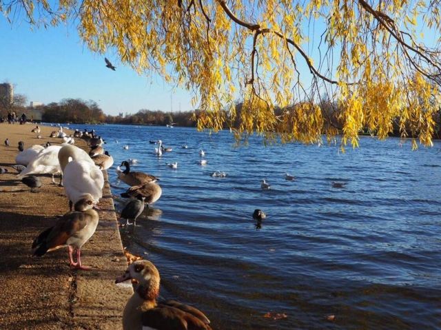 公园的主要入口是东南边的Hyde Park Corner,这里有惠灵顿拱门,进去后往西走不远,就可以看到九曲湖。湖中游着白天鹅,不时有鸽子、飞鸟飞到湖边,映衬着蓝天白云,悠然美丽。三三两两的人在湖边草坪上席地而坐,还常能看到松鼠出没。你甚至可以在这里打发整个下午的时光。