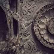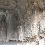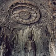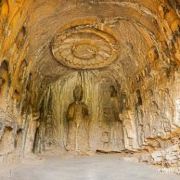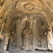 莲花洞位于龙门石窟景区内的西山石窟,因窟顶雕有一朵高浮雕的大莲花而得名。莲花洞大约开凿于北魏年间。莲花周围的飞天体态轻盈,细腰长裙,姿态自如。