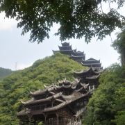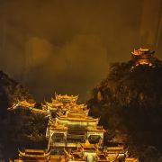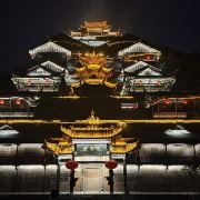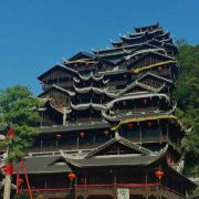 九黎宫是九黎城的标志性建筑,依山而建,高99米,融合四合院、吊脚楼、冲天楼等多种建筑形式,是世界上最高最大的吊脚楼建筑群、最大的四合院建筑群、最奇特的楼中楼阁与楼中殿堂建筑集群。