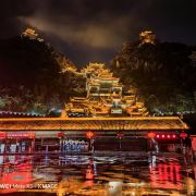常规参观路线是从九道门上山,然后下山参观九黎宫和九黎神柱,广场转圈一圈各种大殿和壁画,赶上节庆日还有大型表演可以看,看完后从购物街出去回到停车场。我们到的时间比较晚,景区已经关门了,所以主要参观了上面三个景点,九黎宫也只看了一楼的布展,没有来得及上楼参观。但来得晚的好处就是没人,我们五个人承包了整个景区,一直等到晚上六点半亮灯,拍完夜景才回程。
