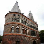 它是吕贝克老城的城门,远处看去就像童话城市的入口:两个高耸的圆柱形顶端相互倾斜交叉,与两方的支撑墙弥合在一起,黑灰色的大烟囱口颇具中世纪风格。