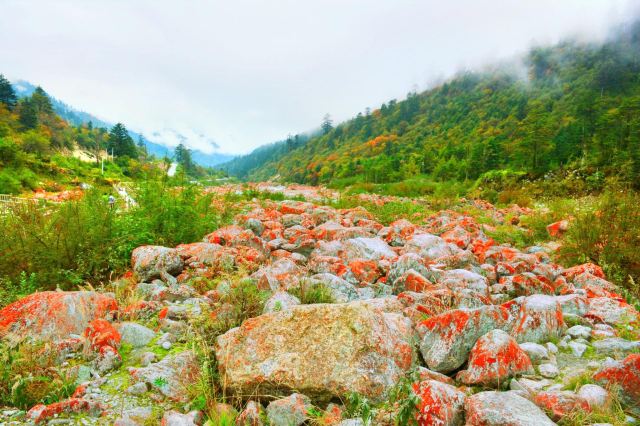 中国红石公园位于磨西古镇到康定中间。红石滩的红石不只一处,在山下和山上的观景台都能看到一片覆盖着藻类的红石,而且还能与红石亲密接触。红石的形成需满足气候、海拔、空气质量等因素,很明显的对比就是刚进入红石滩景区时,公路两边的石头随着海拔的逐步升高,红石就会越来越多,而且随处可见,但快到山顶时,周围的红石也就开始逐步消失。