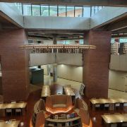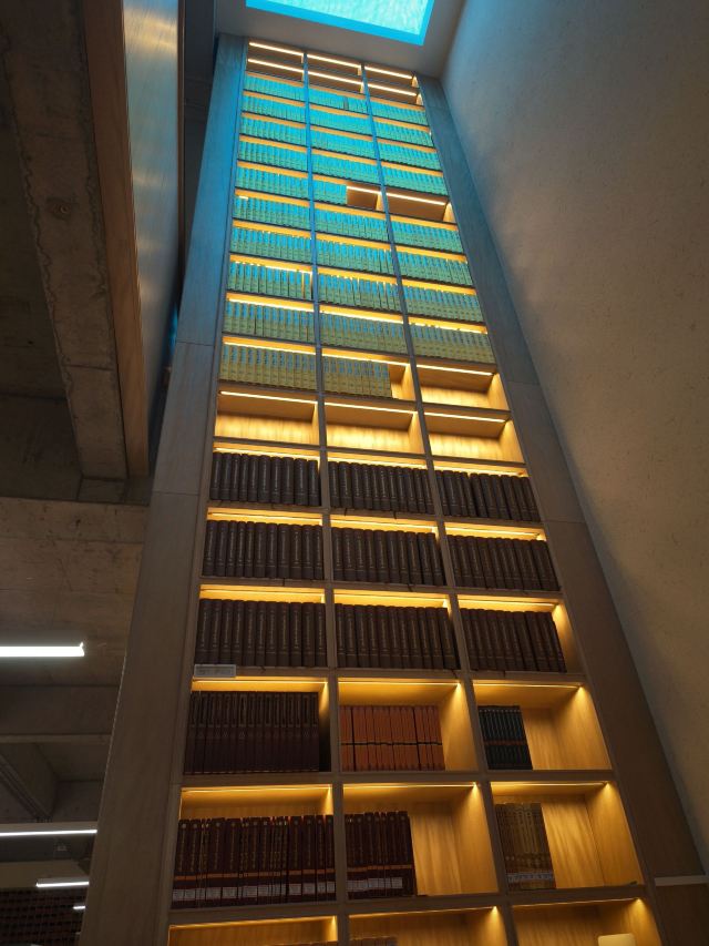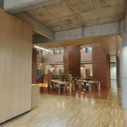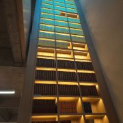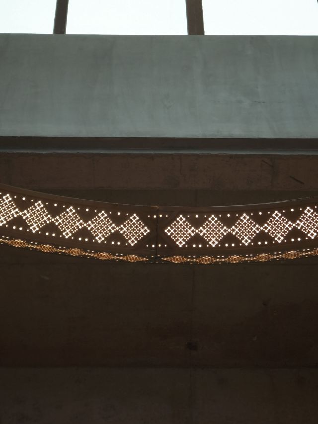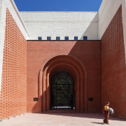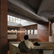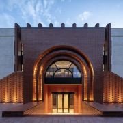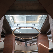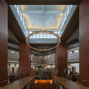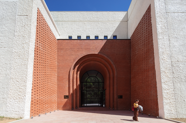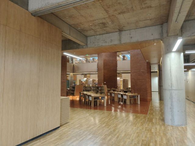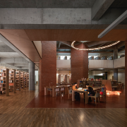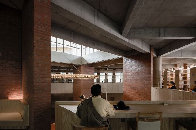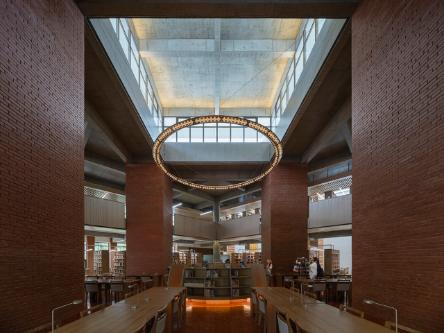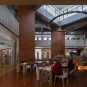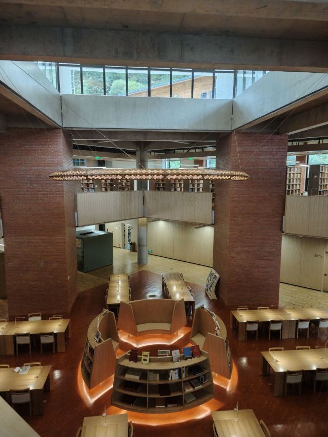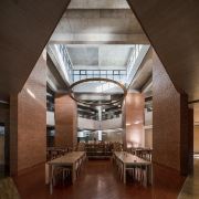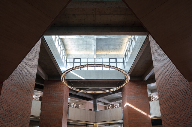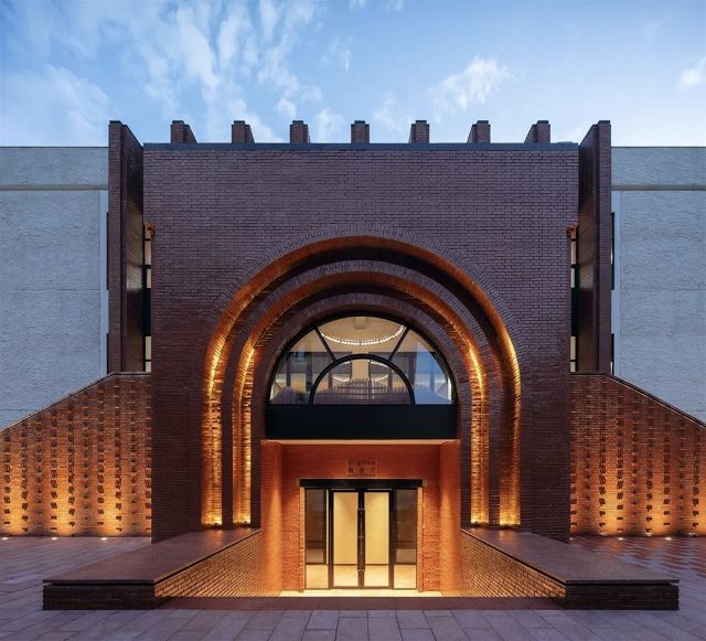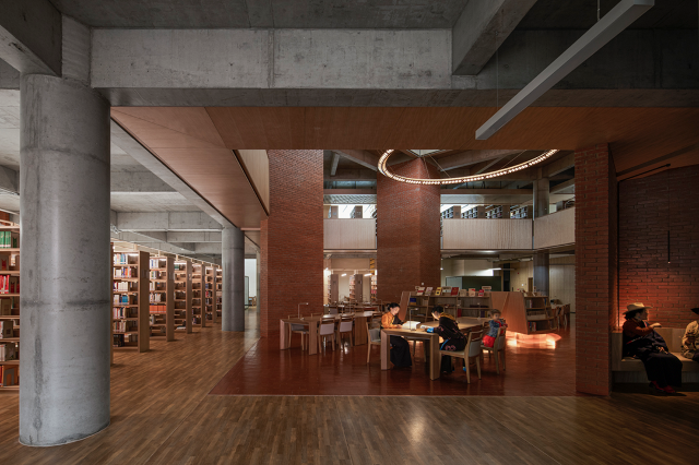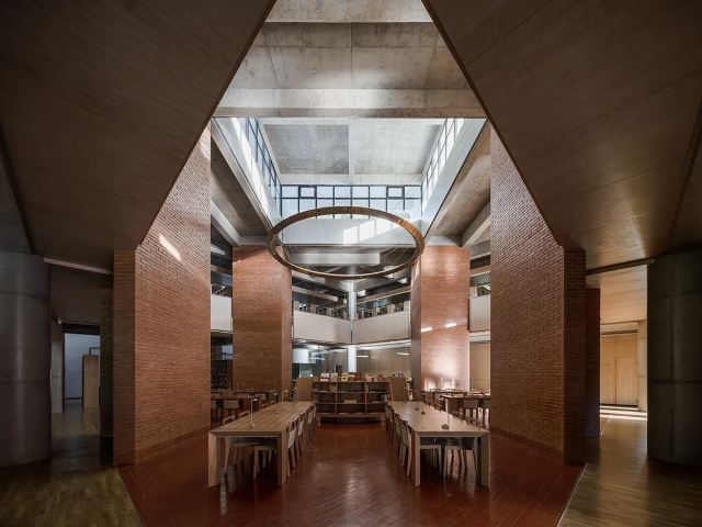 该建筑由江苏中锐华东建筑设计研究院荣朝晖工作室和杭州心象建筑共同设计,主要包括图书馆和藏服饰文化博物馆两部分。博物馆采用了典型的AB空间模式布局,而图书馆则采用了非常明显的向心系统,两者通过一个共用门厅连接在一起,形成一个整体。图书馆采用了中空的四角对称设计,上部中厅的天窗以45度角度扭转,突出了中心的存在。高出屋顶的天窗为内部带来丰富的自然光线,赋予图书馆内部多样的视觉效果。扭转的天窗与中庭内的砖柱形成系统性的扭转关系。图书馆下部的会堂空间与上部的用途正好相反:上部的中庭公共空间变为下部的会堂空间,而上部的使用空间则变为下部会堂的服务空间。