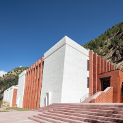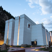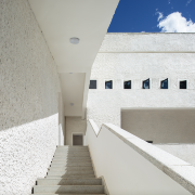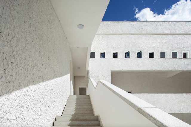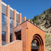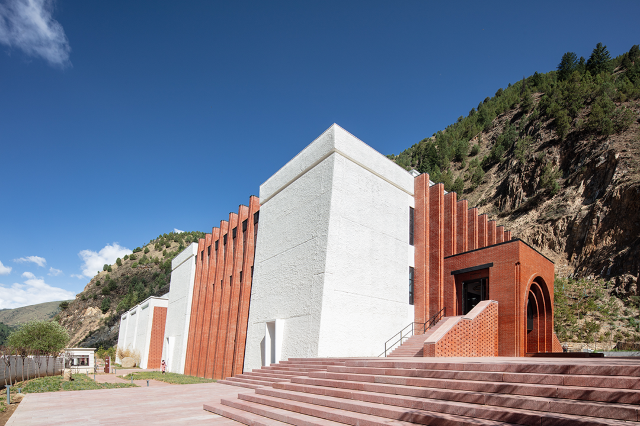 粗糙是藏地建筑的一种基本特质,但这种粗糙背后也蕴含着强大的力量。收分的外墙是很明显的藏区建筑特点,而外部喷浆外墙材料的使用赋予建筑强烈的手工感,自然挂下的浆体呈现出类似布达拉宫泼甜墙工艺的效果。