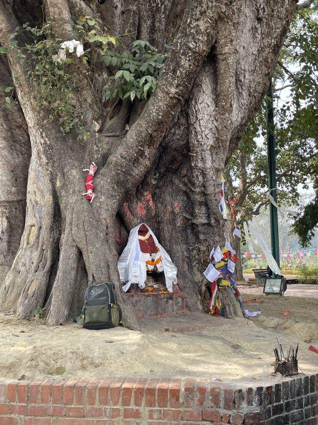 ④裟罗双树:位于主建筑外的粗大古树。释迦牟尼降生于裟罗双树下,原树早已死,但此树也很古老,树干正对着主建筑的一面凹陷处成为1个天然佛龛。四周不少祈福树上还挂着五彩彩旗,类似西藏的五彩经幡,按照蓝、白、红、绿、黄的顺序,分别代表蓝天、白云、火焰、绿水、黄土