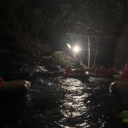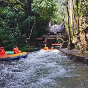 被誉为“浪尖上的过山车”的古龙峡漂流,是广东至刺激的漂流 。 古龙峡漂流赛道的平均坡降为9.5%,超越了世界至大峡谷---雅鲁藏布大峡谷7.5%的平均坡降。至心跳的体验当属古龙峡“神龙回首”河段,180度的大转角,类似雅鲁藏布江大气雄浑的U型大转弯,两岸壁仞千尺,形成一夫当关,万夫莫开之势。高速滑行的皮艇像浪尖上的过山车,飞旋在波峰波谷间,在惊魂未定之际又戛然而止,橡皮艇稳稳跃入一个的清澈水潭里,平静下来,尖叫声似乎还在耳边。