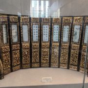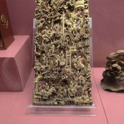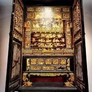 - 金漆神龛:此神龛体量庞大、雕饰精美,为潮州木雕的佳品。采用多层次镂通雕,雕刻密而不乱、人物如生,生动地再现了古人美好的原始信念。