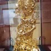 - 宋金项饰:这是“南海一号”沉船上第一件被打捞出水的金器,长172厘米,重达566克,由四股八条纯金线编制而成,一端是葡萄纹饰的长条带钩,装饰有璎珞纹,另一端有四个小圆环方便调节松紧,具有浓厚的阿拉伯风情。它是南海海上丝绸之路的重要物证。
