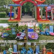②百草园:占地3.54万㎡,种有草本植物、荫生植物、藤本植物、芳香类植物61种,包括白术、三七、射干、丹参等品种,以4个同心花环的园林呈现,每个扇形花坛又用绿篱分成几个小花坛,虽只有一片绿色但很美观