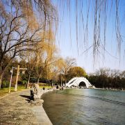 ⑥绚秋园:占地3.7万㎡,种有秋季观叶树20多种,包括红栌、红枫、元宝枫等,春季只有一片绿色,中心的莲池中莲叶密布,黄色莲花绽放,水塘呈方形双环形状,由1条水渠向北连通滴翠湖