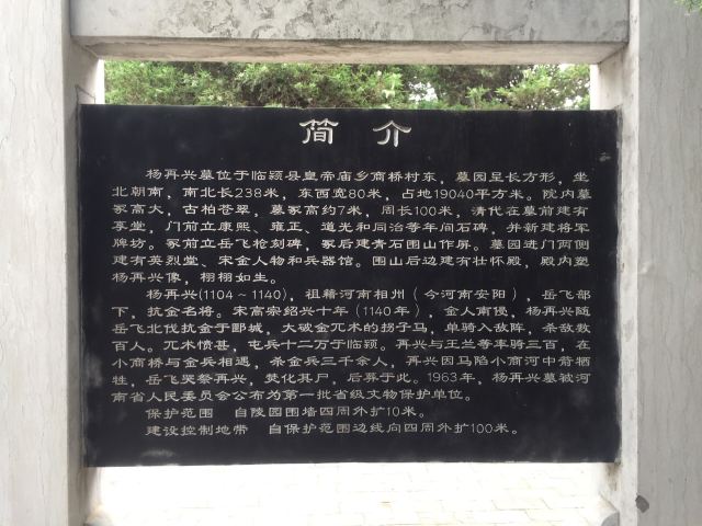 3分 不错杨再兴纪念园位于河南省漯河市临颍县南12公里小商桥景区内小商桥东300米。纪念园占地20余亩,呈长方形,过正门,经碑刻和牌坊,左右两侧展室以图片、影视以及实物等多样形式介绍了宋金时期的主要人物和交战史,中有清代祭庙1座,庙后即为纪念园的中心—杨再兴墓,当地俗称“杨爷墓”,墓高6.6米,冢前有一断碑,相传为岳飞枪尖所刻“再兴坟墓”4字,可惜字迹已模糊不清了。转过墓冢,绕到壮怀殿(因园区管理,原纪念园正门关闭,最先应该经过的壮怀殿变成最后面了),殿前门松柏苍翠,殿内供奉小商桥之战中牺牲的杨再兴及四将,缅怀杨再兴及阵亡将士保家卫国、不畏强敌、英勇奋战的献身精神,壮怀殿为罕见的坐南朝北,殿内的木雕和烙铁画值得一看。整个纪念园,归附在小商河景区,门票40元,游人少。