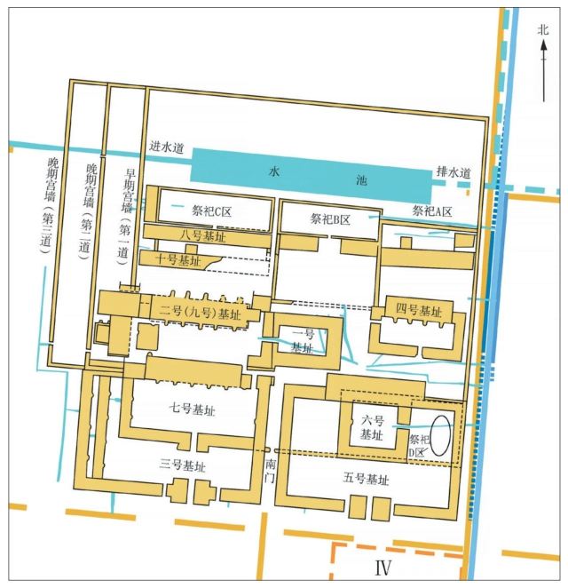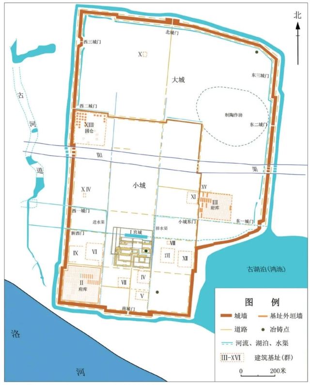 用石块砌筑的方形排水道。在大城城墙上已发掘城门5座,发现护城河、排水道、蓄水池等。遗中的小城,面积约80万平方米,有府库、铸铜作坊和宫城及周围成排的基址群,武库、粮仓或屯兵防卫的城堡。宫城居中,为正方形,内有成组的大型宫殿基址,面积超过45000平方米,内部有池苑区、祭祀区和宫室建筑群区。宫室建筑分为左右两排,东面两重院落是不同时期的宗庙,西面建筑基址自南向北依次为“前朝”、“内朝”和“寝殿”。偃师商城遗址出土器物近万件,数量最丰富,有陶器、铜器、玉器等。