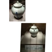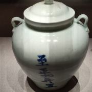 此文物为元青花。口径9.2厘米,底径9厘米,高22厘米,腹径17厘米。直口,浅圈足,肩上有对称竖耳,有盖,盖顶隆起,盖表面有砂粒,宝珠状钮,腹中部有釉下毛笔楷体书(至正七年置)青花款识铭文,青花发色浓艳鲜丽,具元代特色。器物端庄规整,釉色莹润,为景德镇窑的典型产品。