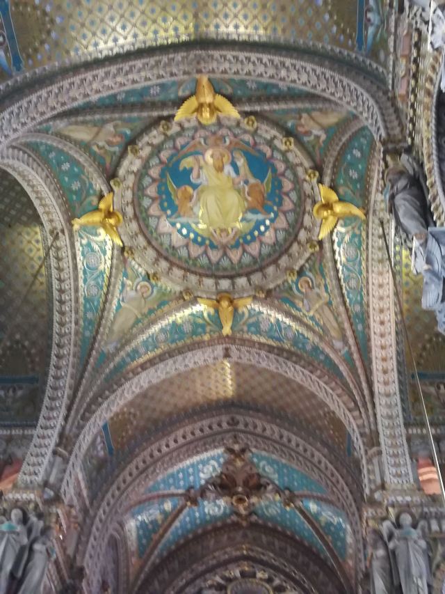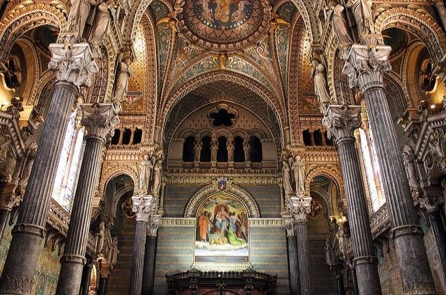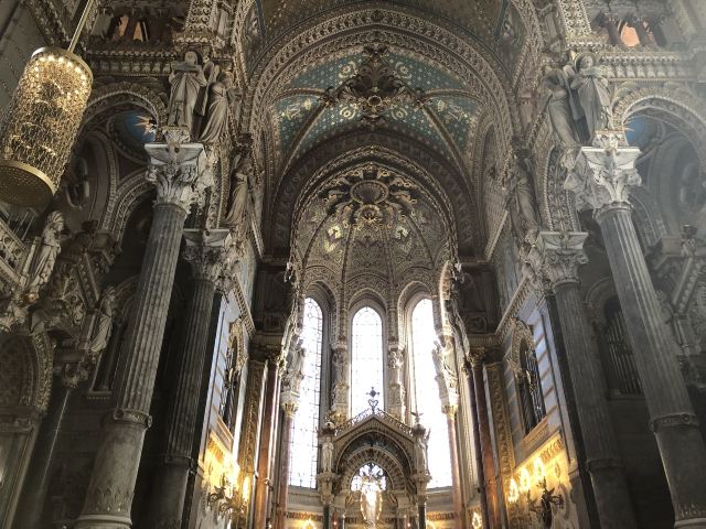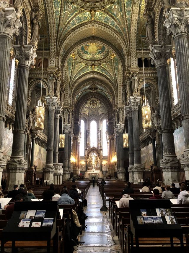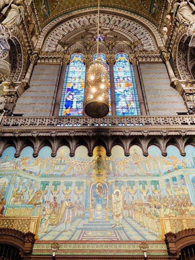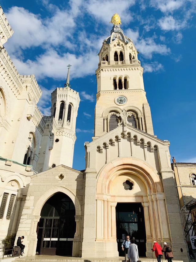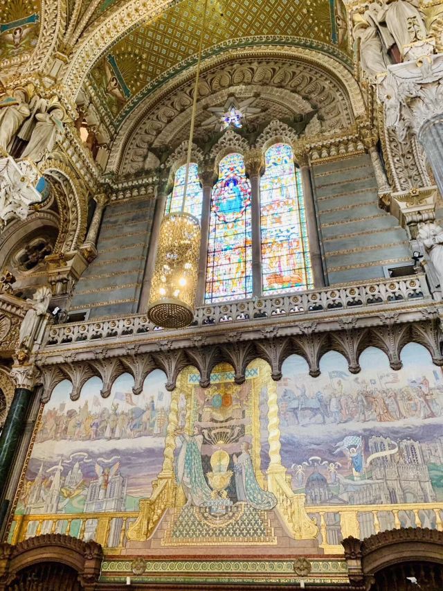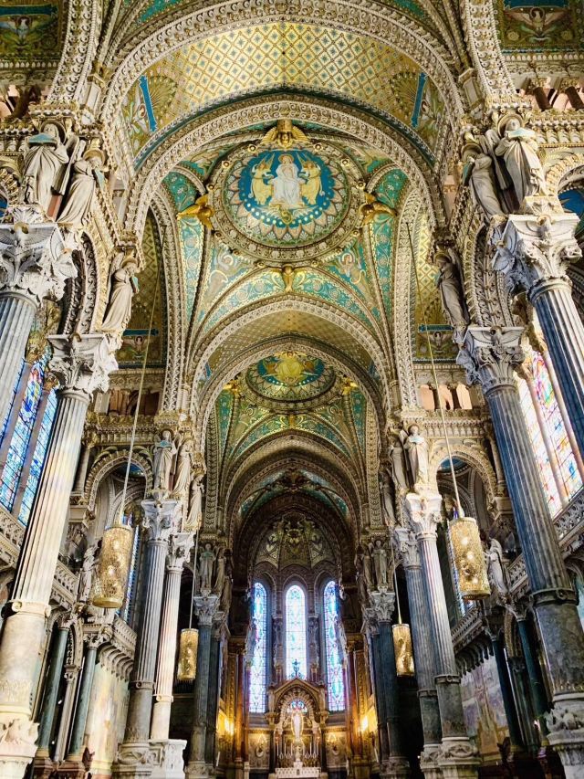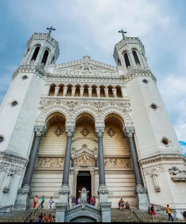 走近教堂,你会发现这里融合了拜占廷和中世纪的建筑风格,白色大理石的外围墙壁,硬朗挺拔;讲述着圣经内容的花纹玻璃,在阳光下五彩斑斓;教堂内马赛克镶嵌壁画和绘画作品精致美妙,让人惊叹。教堂左侧有一个观景平台,可以让你轻松俯瞰里昂全貌。