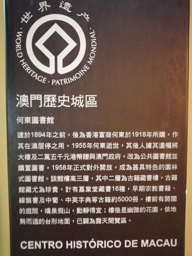 4分 满意何东图书馆是坐落在澳门特别行政区岗顶前地的公共图书馆,楼高三层,与圣诺瑟修院相邻,是一座集历史、文化、建筑艺术于一体的楼宇。门口有简介牌子。该建筑物于2005年作为澳门历史城区的组成部分被列入世界文化遗产名录内。