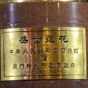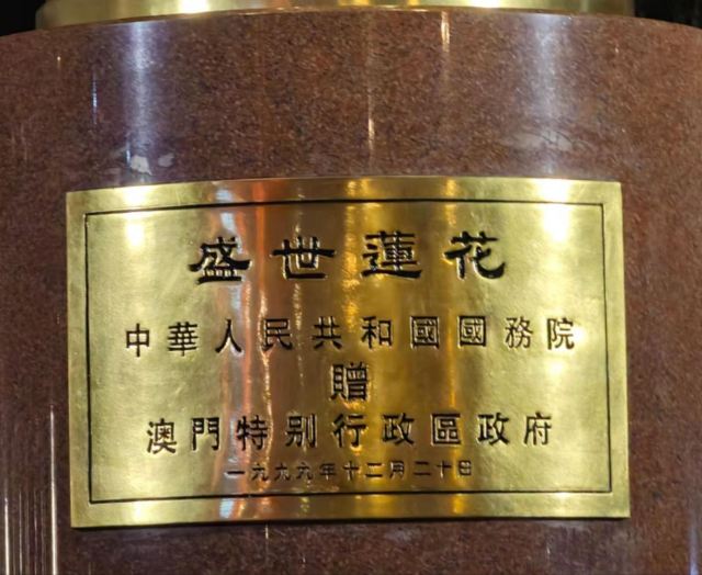 1999年12月20日,是澳门回归祖国的一天,由中国国务院赠送的大型铸铜贴金雕塑“盛世莲花”于综艺馆前的金莲花广场揭幕,这里也因此成为了澳门回归纪念景点。 “盛世莲花”主体部分由花茎、花瓣和花蕊组成,共16个造型,采用青铜铸造,表面贴金,重6.5吨;基座部分由23块红色花岗岩相叠组成。雕塑总高6米,花体部份较大的直径为3.6米。莲花是澳门特别行政区的区花,莲花盛开 、亭亭玉立、冉冉升腾,象征澳门永远繁荣昌盛。三层红色花岗岩相叠的基座,形似莲叶,寓意澳门三岛。