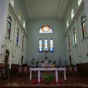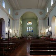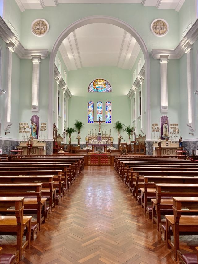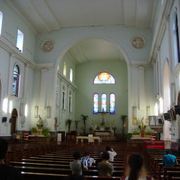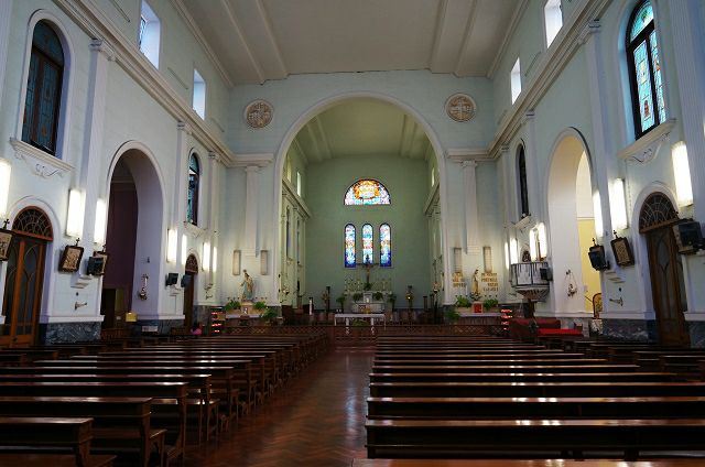 这是一座外表呈现灰色的三合土建筑,建筑富西班牙宗教色彩,外在大气沉稳、宏伟典雅,内部精丽巧饰,曾存有不少天主教遗物及古迹。教堂可分为两大部分,正中的是教堂主体,进入其间可以感受到庄严圣洁的气氛。入口处是一面木制葡萄牙屏风,素洁的墙壁上装饰简洁。两侧墙上都有高窗,窗户上镶嵌着富有宗教艺术气息的彩绘玻璃。如果遇着周日,可以进去听一会弥撒。教堂前地有一个小型的广场,地上铺设黑白两色的葡式碎石,广场内有一座特色的小型喷泉,将这里营造成一个优雅宁静的景点。