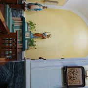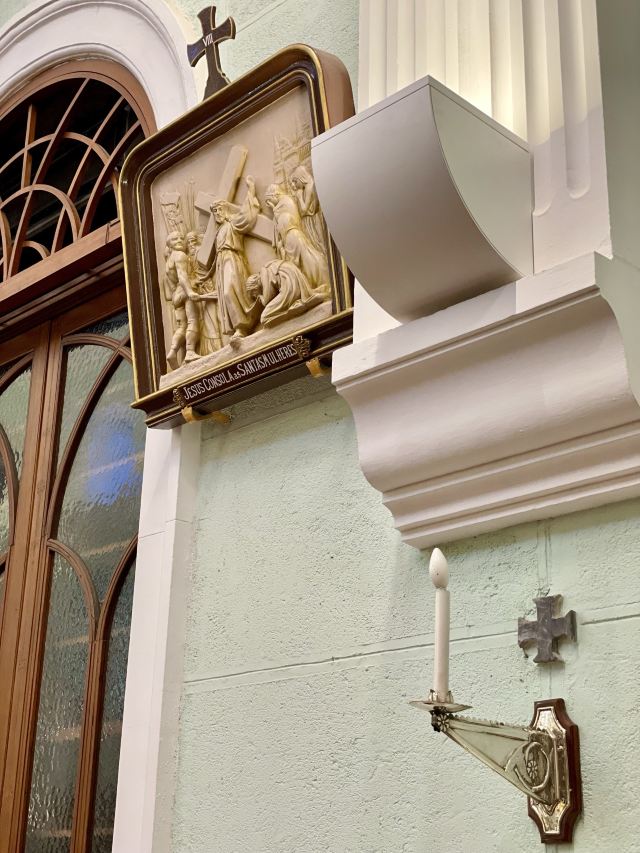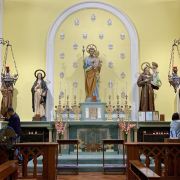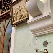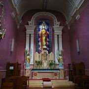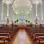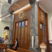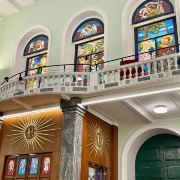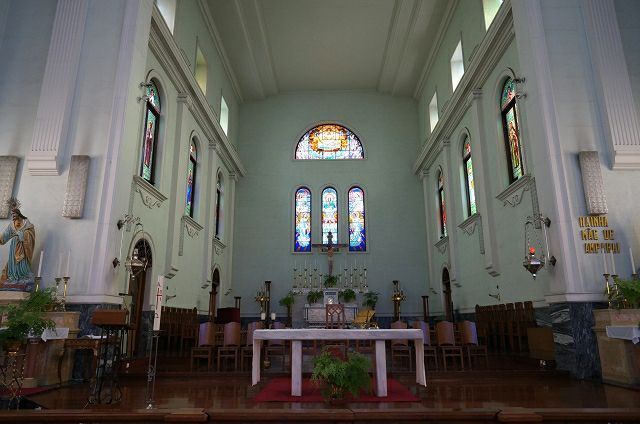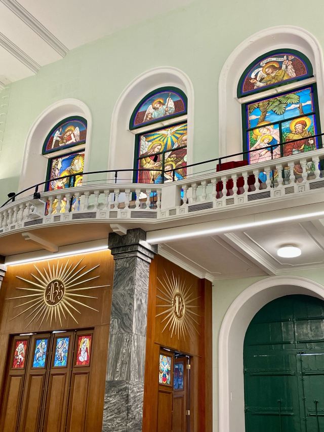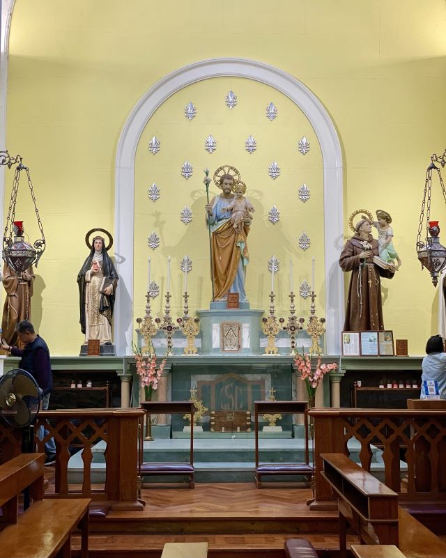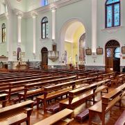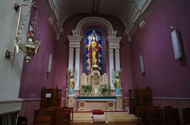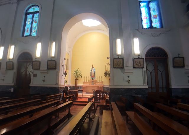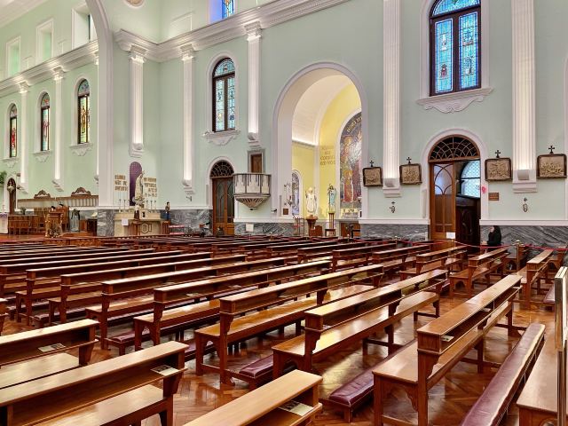 走进教堂内部,你会被那精致的装饰所震撼。高高的天花板上装饰着精美的吊灯和绘画,而主祭台则是用精细的大理石制成,展示了极高的工艺水平。教堂内部的彩色玻璃窗更是一大亮点,透过窗户映入的彩光为这神圣空间增添了几分神秘与庄严