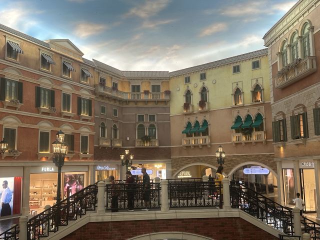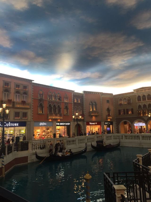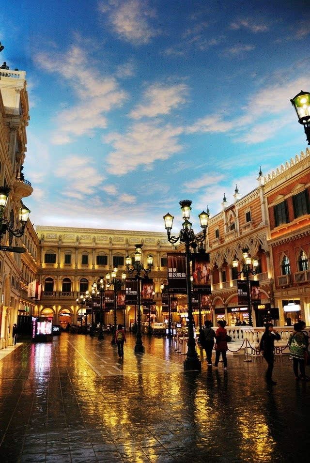 整个购物中心被一幅偌大的天幕覆盖,天幕可配合电脑控制的灯光效果,营造出晨昏日出日落的云彩和天色,配合特色街道、运河、157呎的里亚特桥,环境典雅瑰丽,令旅客仿如置身昔日威尼斯的街道。真的是超美的。