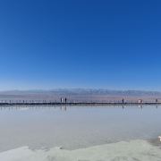茶卡盐湖是一座有三千多年历史的盐场,湖水含盐量很大,会自然结晶成为一片白色的湖面,将天空、云朵和对岸的山都倒映在湖里,景色非常漂亮。游客还可以赤脚走到湖面上观看和拍摄自己的倒影,犹如天空之境。