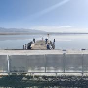 沿着通道走到湖边,就可以看到洁白纯净的茶卡盐湖,尽情游玩。湖中间有一条铁路延伸至湖内,起点处便是乘坐小火车的地方,可以乘车前往湖内深处,那里的景色更为纯净。