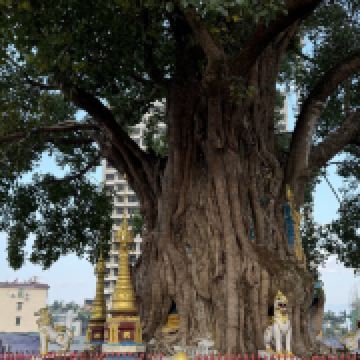 别致的树包塔,塔身象一个立地的金刚,威严气派,伟岸的菩提树像一把撑开的巨伞护住塔顶。粗壮的树冠手臂般伸向天空,古铜色的树干奇倔弯曲,紧紧裹住塔身,树壁犹如飞瀑落地,沐浴着塔基,树包着塔,塔拥着树,相互依存,相映成趣,形成了独特的树包塔奇观,驰名滇西及东南亚。