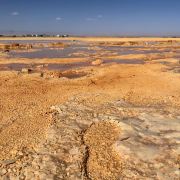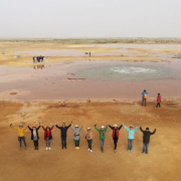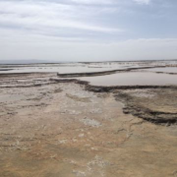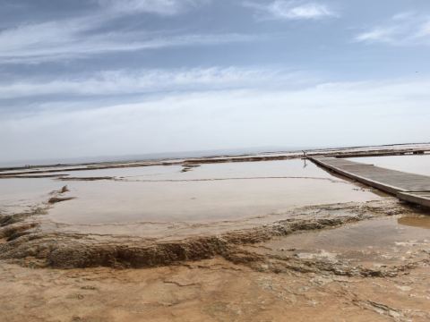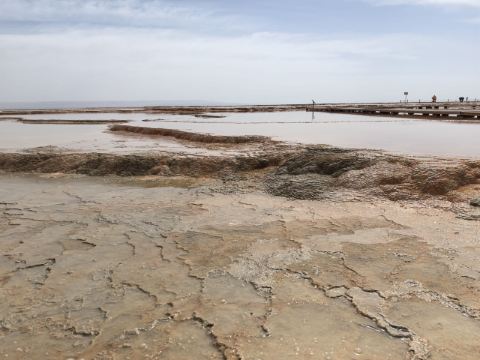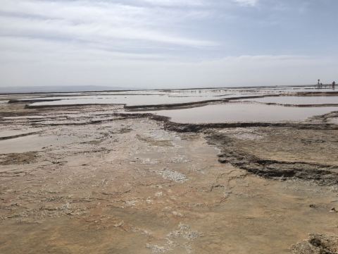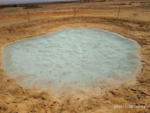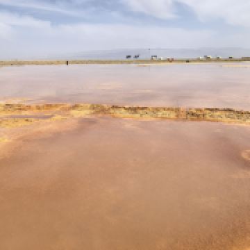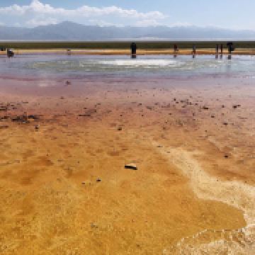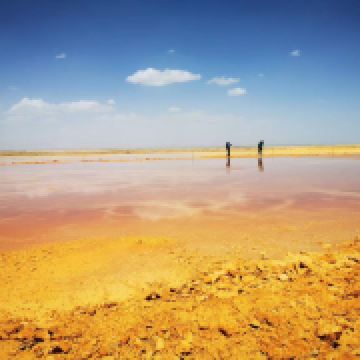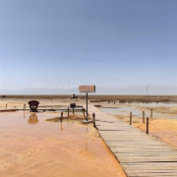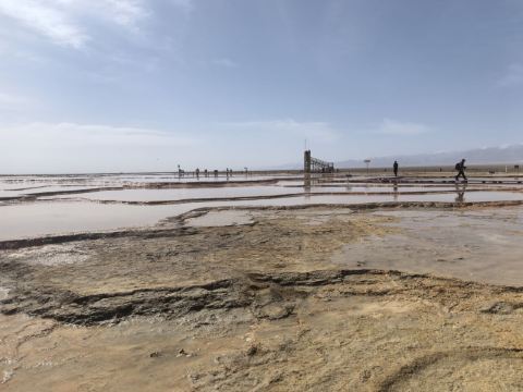 茫崖艾肯泉是由两个相距四百步的涌泉组成,各自周围形成相当深的小湖,西边那个湖是一个矿泉湖。在大泉周边点缀着许多青色的小泉眼,为天青色的盈亏小泉,如小行星围着太阳。在泉水的四周,踩上会发出咔哧咔哧的声音,土质十分疏松一不留神便可能陷进去。