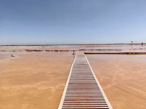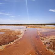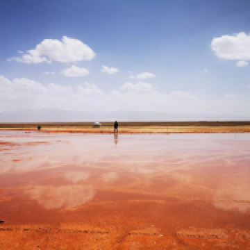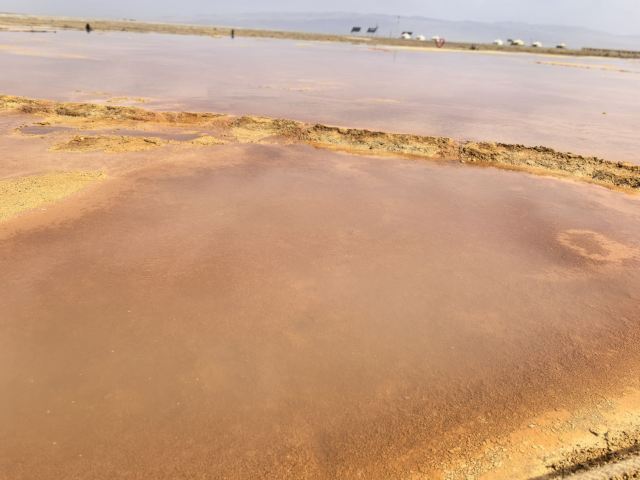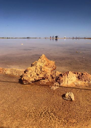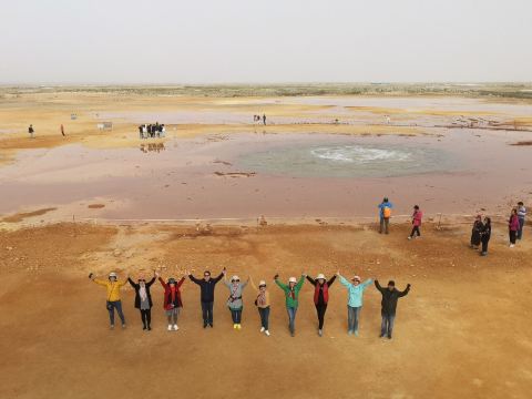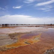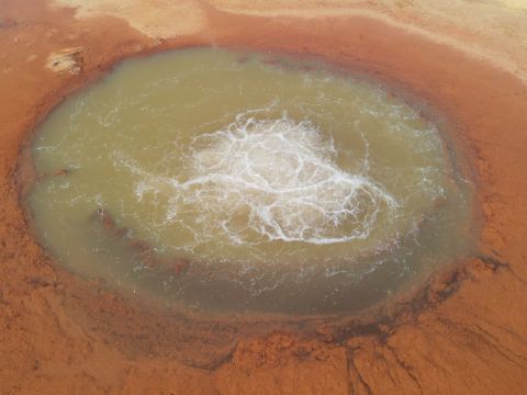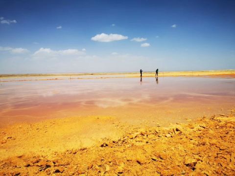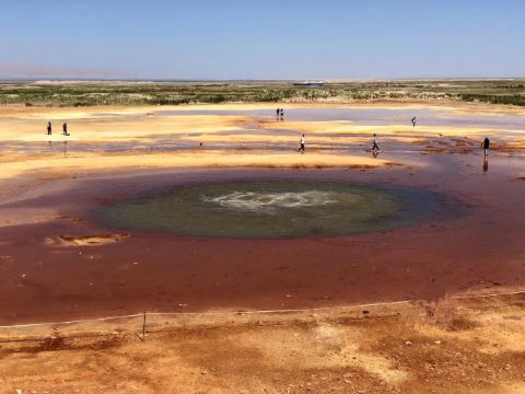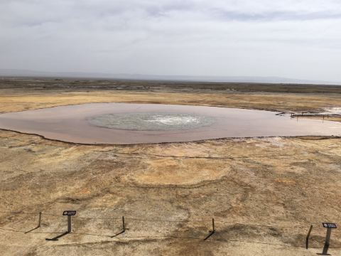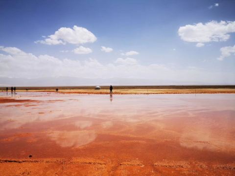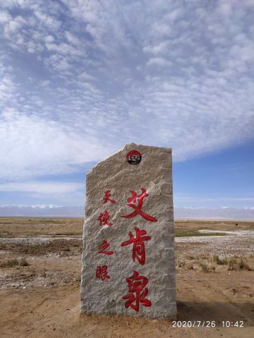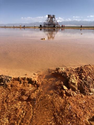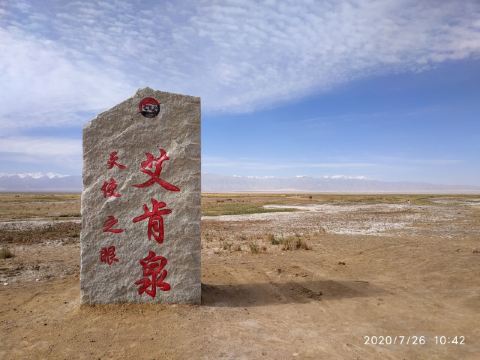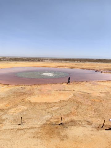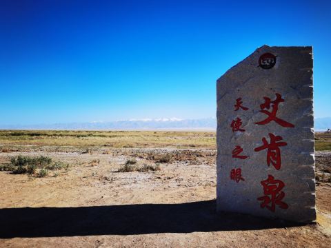 在芦苇鸭草沼泽深处有一股自然喷涌的泉水——艾肯泉(热水泉)。“艾肯”是可怕的意思,褐红色的热水泉,是茫崖额头上吉祥的印记,在宝蓝的天空下更加耀眼~只见泉水翻涌,从地下喷出,忽大忽小,如煮着开锅的羊肉汤,闻着淡淡的硫磺味,踩在火烧过般坚硬的红土岸,看涡旋喷涌的泉水,有人不禁大吼几声,水似乎变大了,故又名“吼泉”。