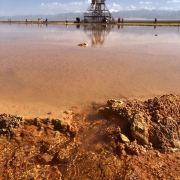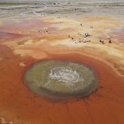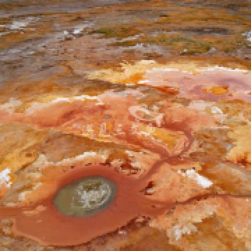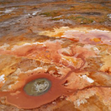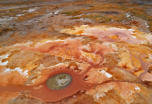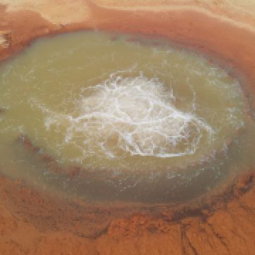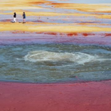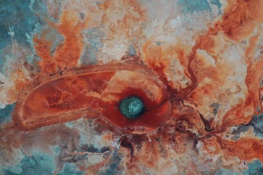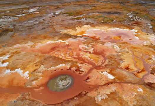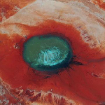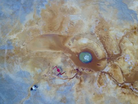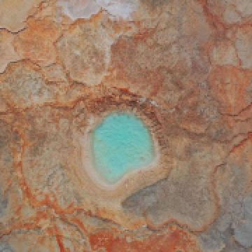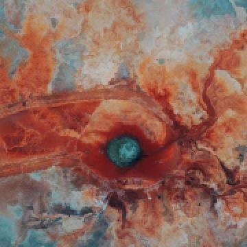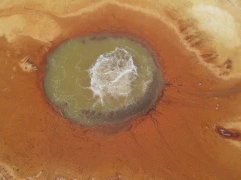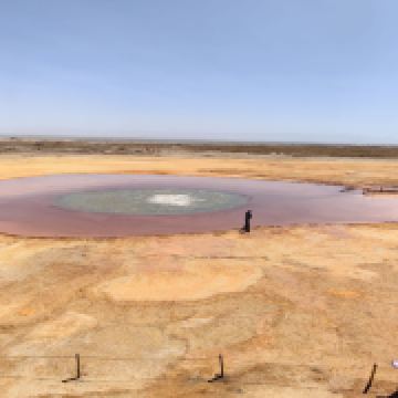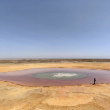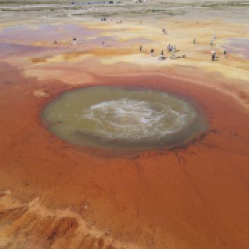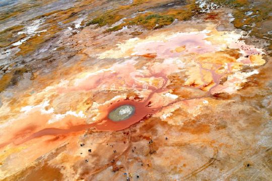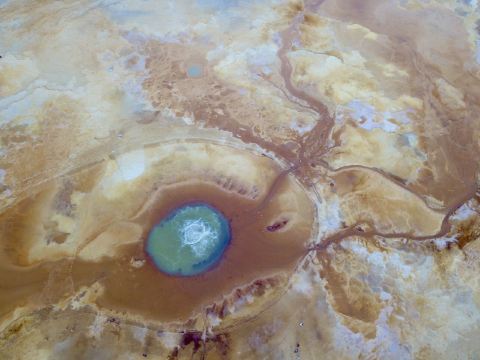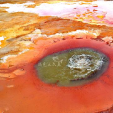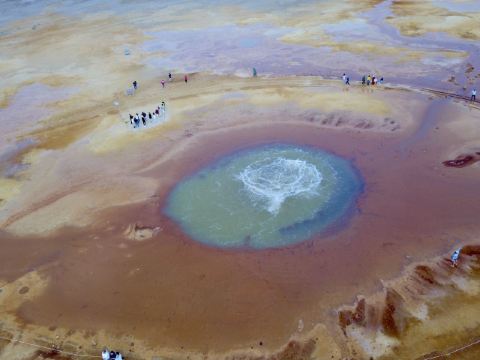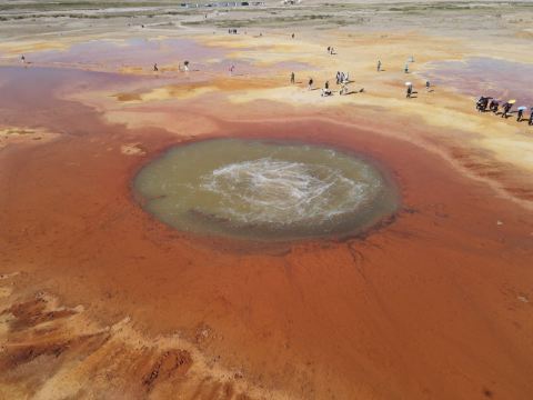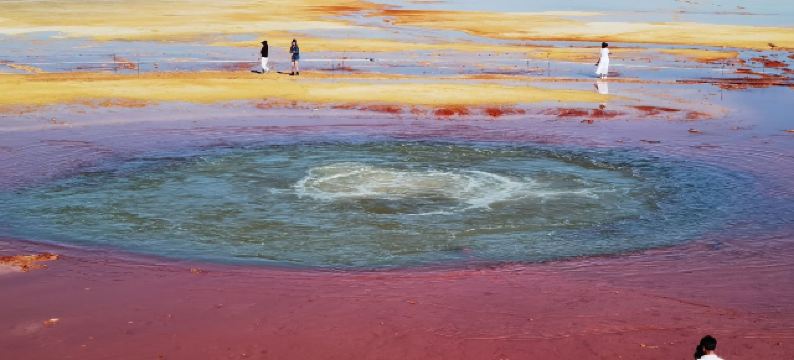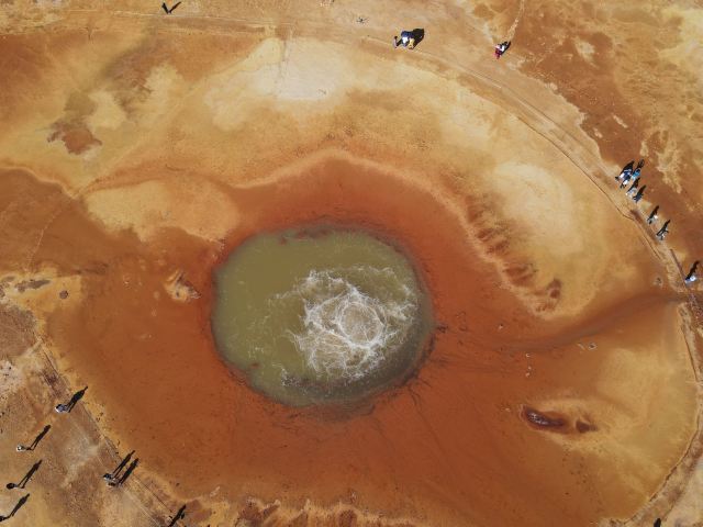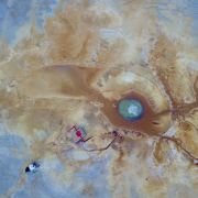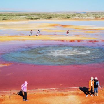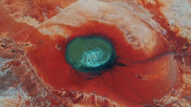 茫崖艾肯泉是喷涌千年的地热喷泉,虽然其泉水流经的地方寸草不生,但是萦绕其周围那红黄相间的草滩,红褐色的沙石,像极了一块圆形的调色板,造就了天地间一幅色彩斑斓的油画形似椭圆的艾肯泉直径就有10多米,绿色的泉水,如同沸腾的开水,咕咕上涌,奔流不息。因长期蒸发,泉水里的矿物质在土地上沉淀出深红环带状的“天眼边界”。从空中俯瞰,泉眼与喷涌而出的泉水组成了“大地瞳孔”的造型。脉络清晰,栩栩如生,在摄影爱好者的镜头下,宛如一只振翅高飞的凤凰。