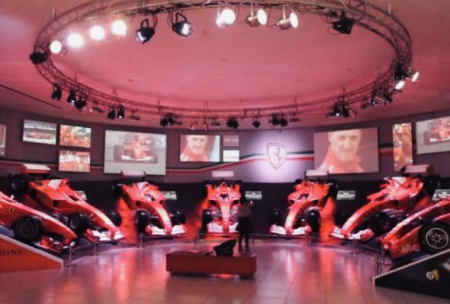 博物馆于1990年开放,其玻璃幕墙充满现代时尚感,周遭悬挂的红色条幅上记录着法拉利F1车队200多次光辉成绩。白色大门上有醒目的法拉利跃马Logo,旁边还有官方纪念品商店。
