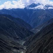 觉巴山并不高,垭口的标高也只是3940米,但由于澜沧江千百年来的深深下切,使得江岸壁立千仞,一派荒凉与坚硬,给人以山高谷深的感觉。这里是横断山区的有名险段之一,30公里盘山路,近2000米的相对高差使觉巴山成了川藏线上较难爬、较费时的一座山,公路在绝壁上延伸,既没有护栏也没有路标,不少地方都是紧靠山体硬生生地开凿出来的,上依绝壁,下临深渊。川藏线虽然号称天险,但危险的地方其实只有几处,比如排龙天险、通麦天险和怒江天险。与这几处名声在外的天险相比,觉巴山的知名度确实不高,只有身临其境的人,才知道这个没有名气的天险与其他几个名声显赫的天险一样,同样让人望而生畏。