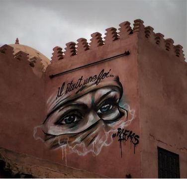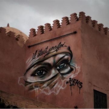 马拉喀什街头有很多有关柏柏尔妇女从面纱里露出的双眼的纪念品,颇有神秘感。上面的文字意思是“从前”。