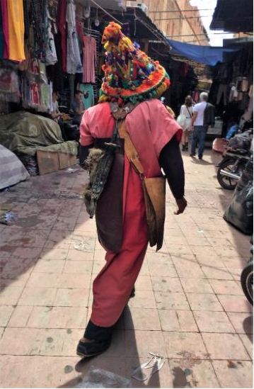 还在琢磨之际,身边走过一人。只见他身穿已经褪色的红衣服,头戴一顶缀满金属片的三角帽,身上交叉背着一个脏兮兮的皮包,另一边是一个羊皮囊。后来Akim告诉我这是一个卖水人Grab。