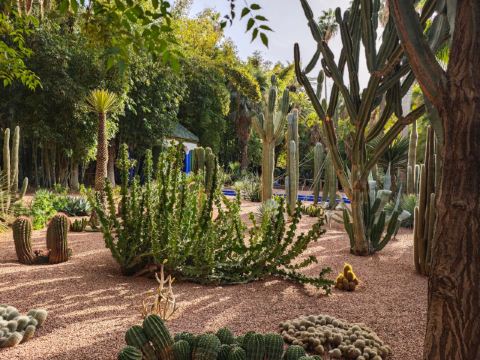 著名的马约尔花园,伊夫•圣罗兰(YSL)博物馆和帕帕尔博物馆是马拉喀什极为著名的参观景点。这三个景点都集中在一起。花园里遍布雄伟的植物、仙人掌和花卉。入口处稍显拥挤,排队等待时间约15-20分钟。需提前三天在线购票以确保入场资格。可购买包含三大景点的联票:YSL博物馆、马若雷勒花园,以及园内虽小但内容丰富的柏柏尔博物馆(Musée Berbère Jardin Majorelle)。游览这三个景点至少需要3小时。