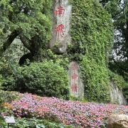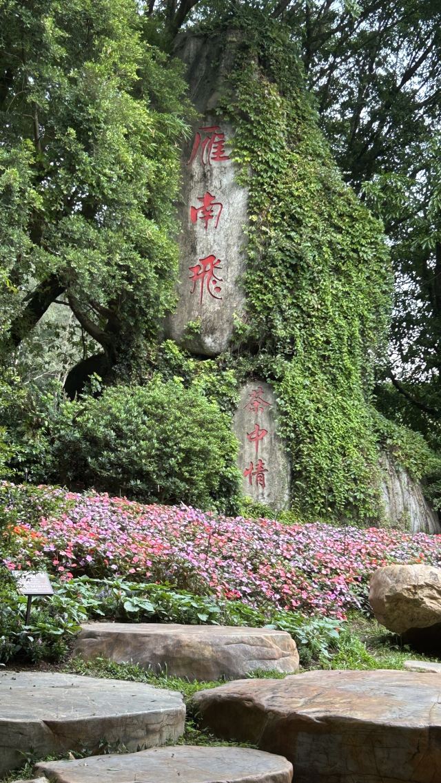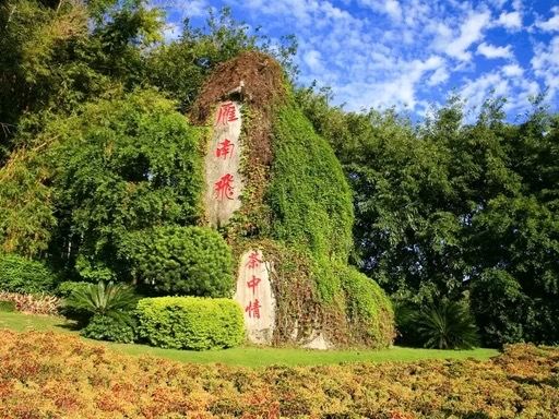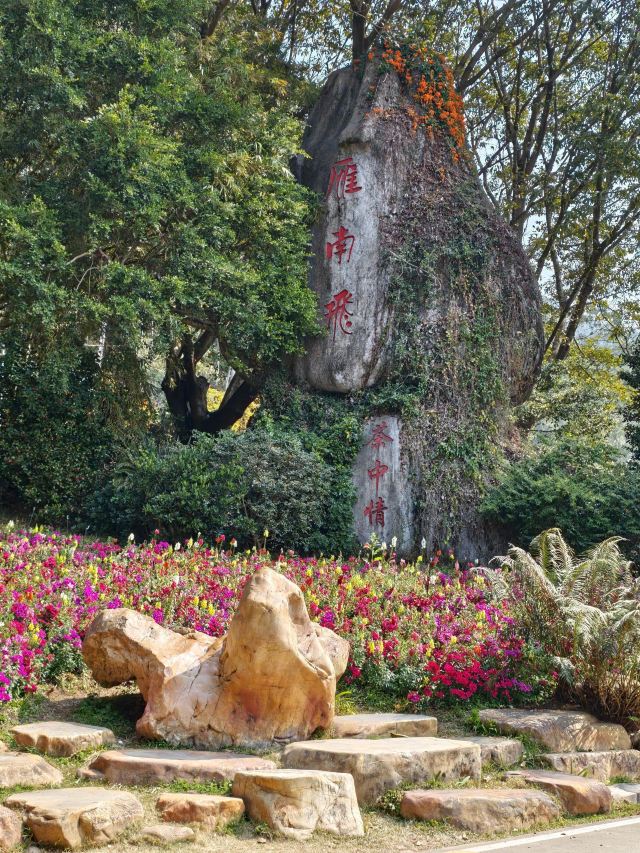 雁南飞茶田景区-雁南飞神石是度假村的标志性建筑,上面刻有“雁南飞、茶中情”六个字,“茶中情”表为内涵,与茶结缘,与茶会友,与茶传情。