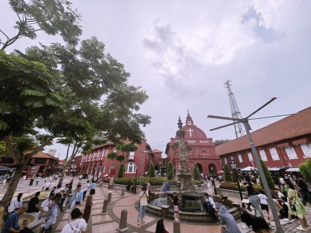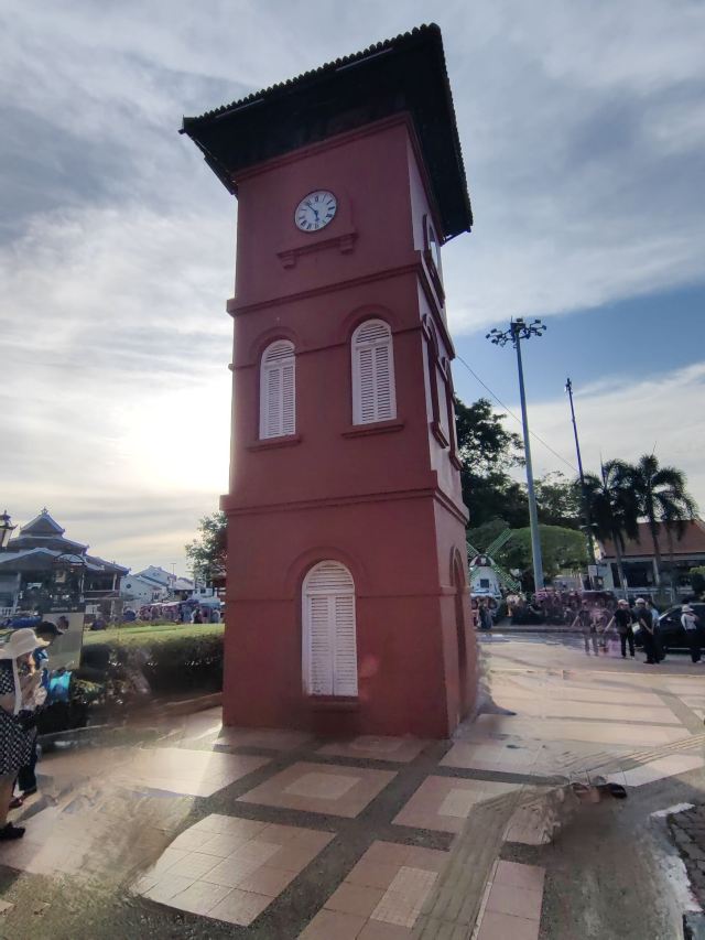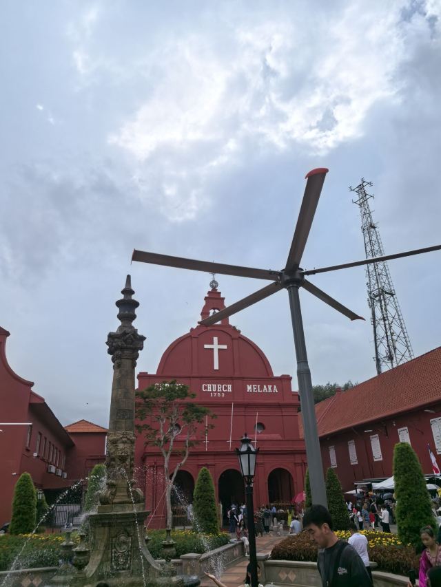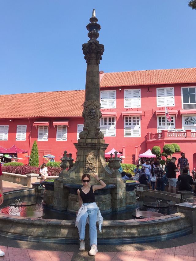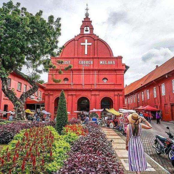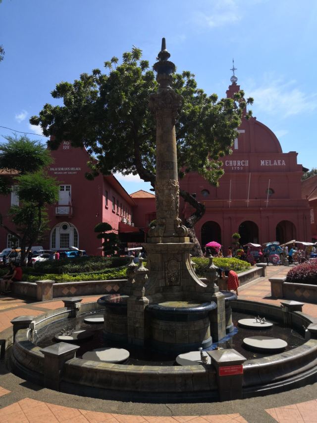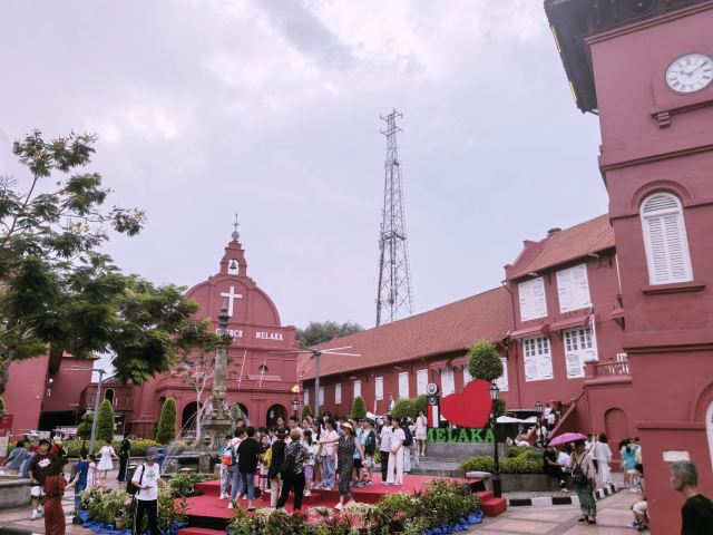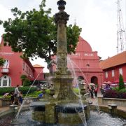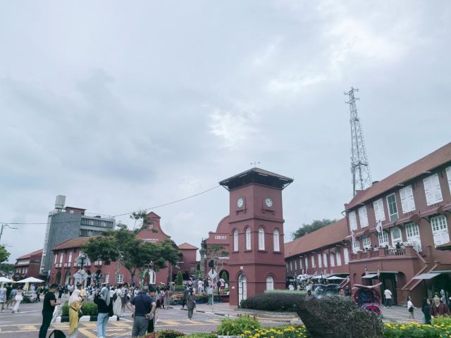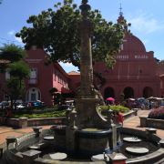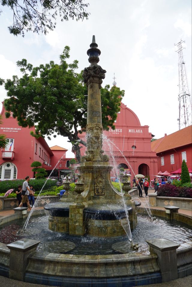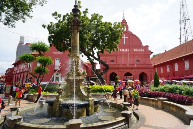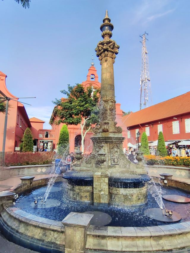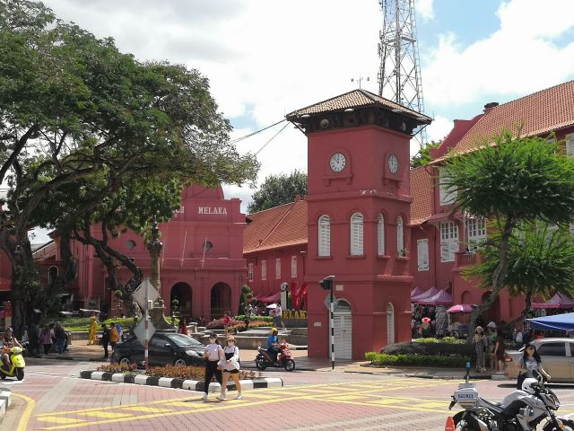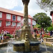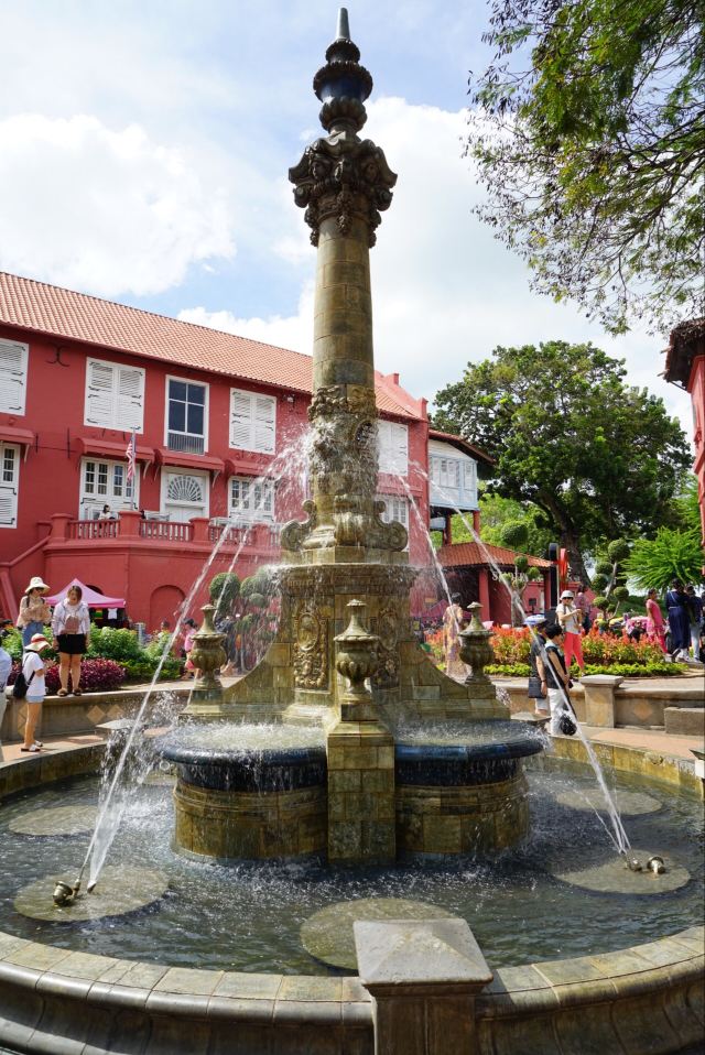跨越马六甲河桥,到了河的东岸,映入眼帘的是一个整洁的广场,广场上有一座红色的钟塔和维多利亚时代所建的喷泉,和其他所有喷泉一样,总会有游客向里面投硬币来许愿。广场周围都是荷兰式的红色建筑物。面对广场的就是古老的荷兰红屋了,它是荷兰人在东方所保留的比较古老的建筑物。荷兰红屋有厚厚的红砖墙,笨重的硬木门,门前是宽阔的石级。
