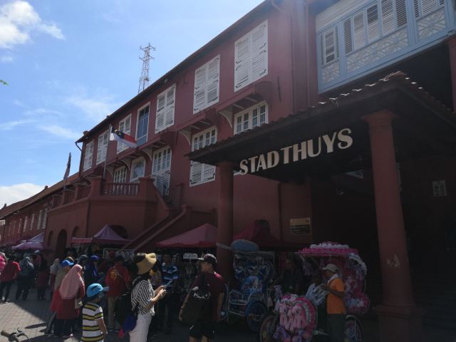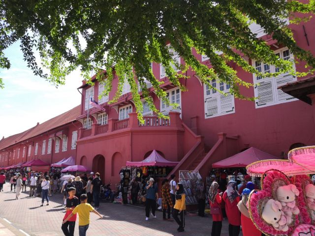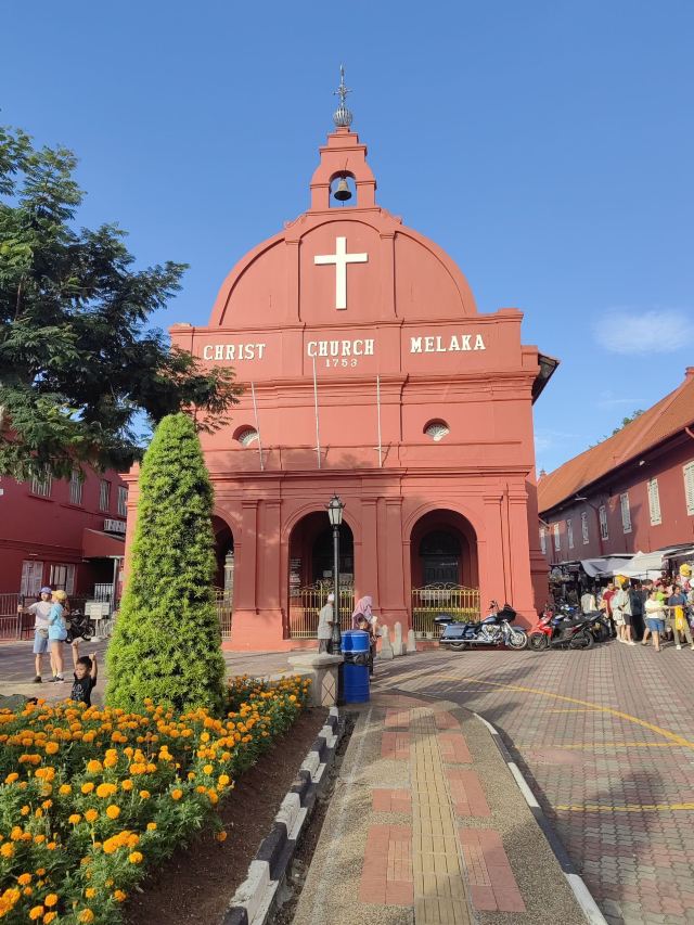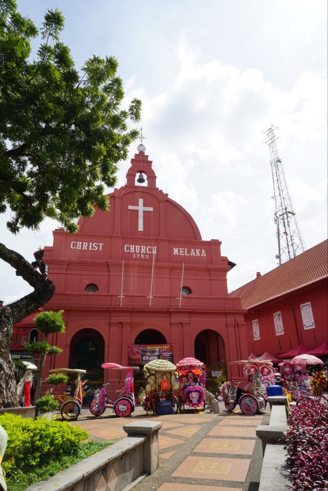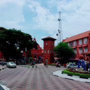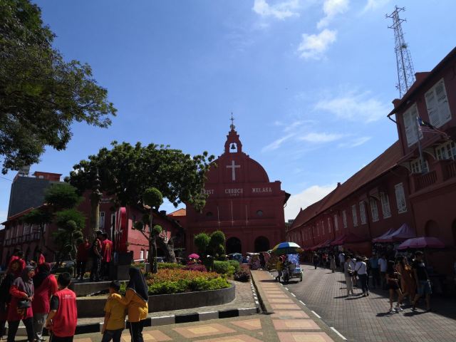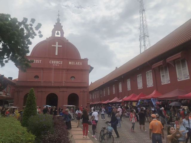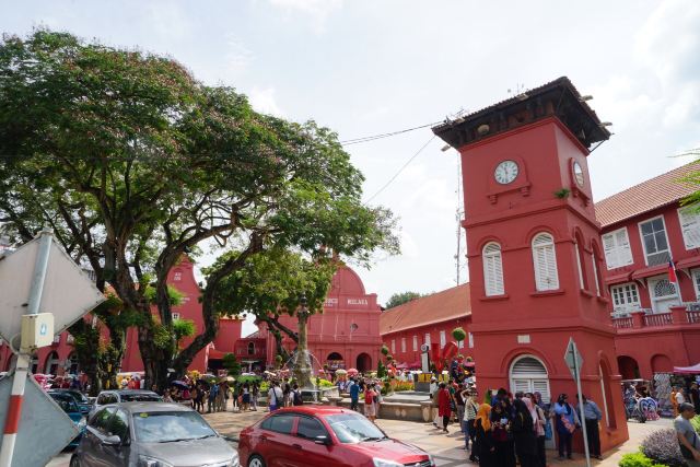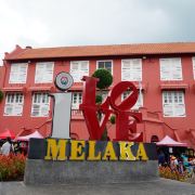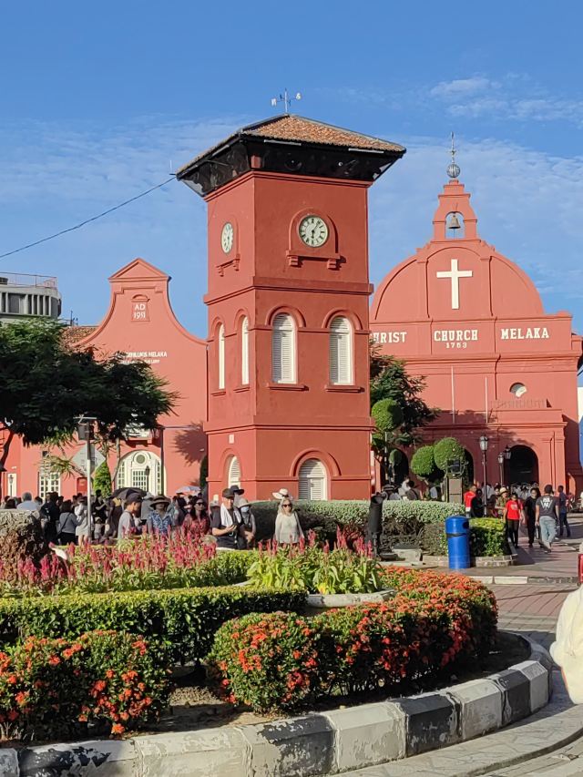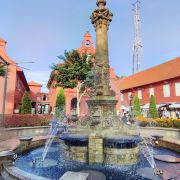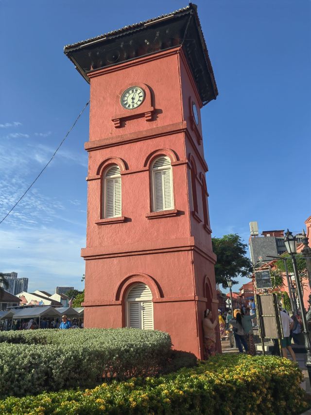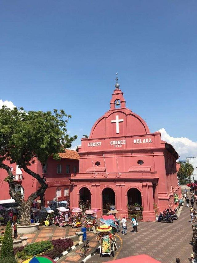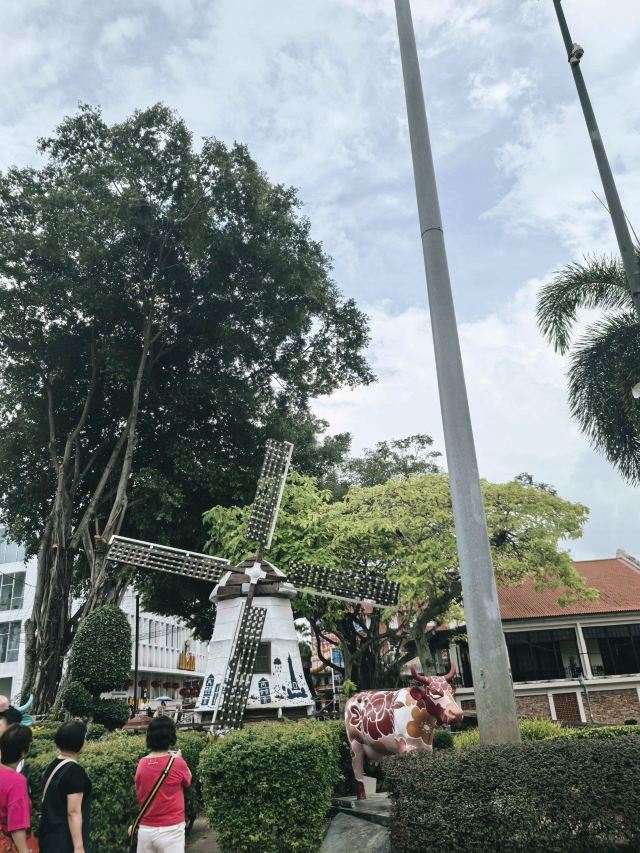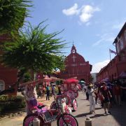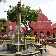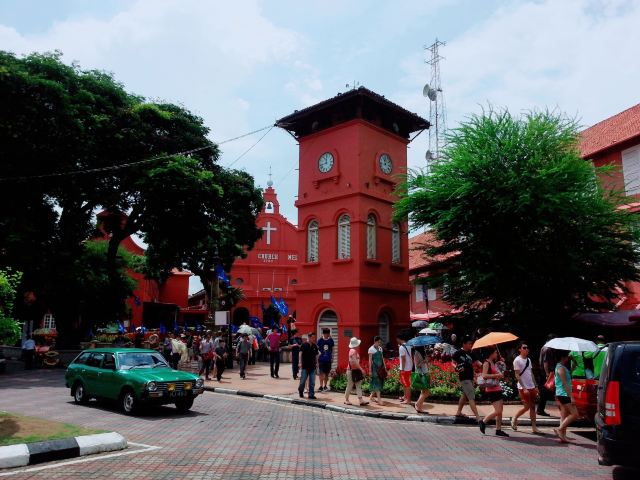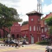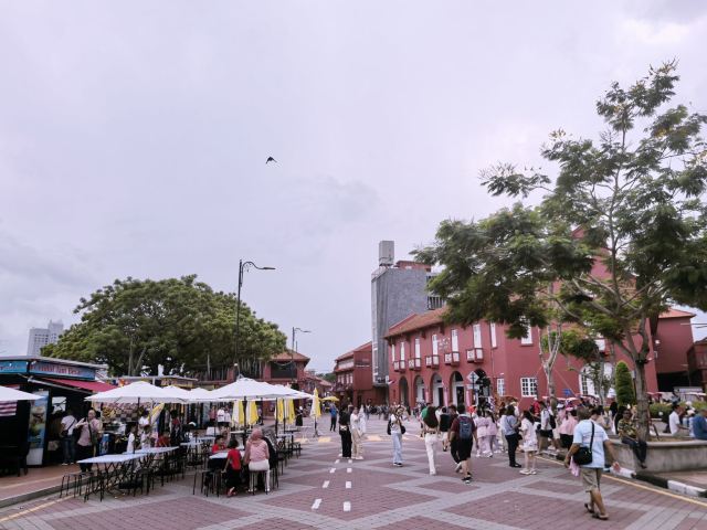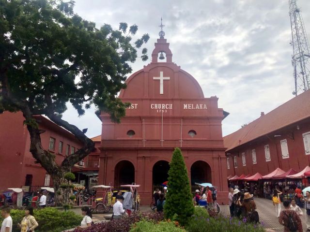 跨越马六甲河桥,到了河的东岸,映入眼帘的是一个整洁的广场,广场上有一座红色的钟塔和维多利亚时代所建的喷泉,和其他所有喷泉一样,总会有游客向里面投硬币来许愿。广场周围都是荷兰式的红色建筑物。面对广场的就是古老的荷兰红屋了,它是荷兰人在东方所保留的比较古老的建筑物。荷兰红屋有厚厚的红砖墙,笨重的硬木门,门前是宽阔的石级。