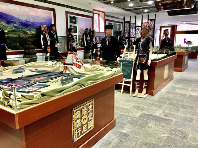 其中哈尼族生态博物馆分上下两层,设有名人录、文学艺术、服装服饰、茶文化、纺织工艺、农耕文化和饮食起居等专项展厅,有近千件实物展品和百余幅图片资料,并附有简要的文字说明。展馆建设大都采用可再生利用的竹子为建筑材料,外观设计体现了与自然和谐、与居地和谐这样一种独特纯朴的观念。展品内容丰富多样,集趣味性、观赏性、知识性于一身,是一处难得的学习交流、了解民族文化的场所。