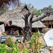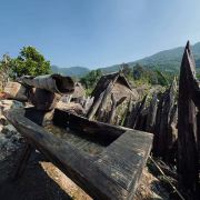 走进村寨,是一片开阔的打歌场地,平时寨子里剽牛、拉木鼓等佤族特有的集体活动都是在这里举行。整个寨子都是干栏式的竹木房子,朝阳背山,错落有致。圆木是支撑房子的骨架,竹板铺地,木板围墙,茅草盖顶,屋檐伸出,即遮阳又挡雨。土著的佤族人热情好客,过着自给自足的简单生活。每当有游人来此,他们会敲起木鼓,唱起“加嘞加嘞塞~”来欢迎。
